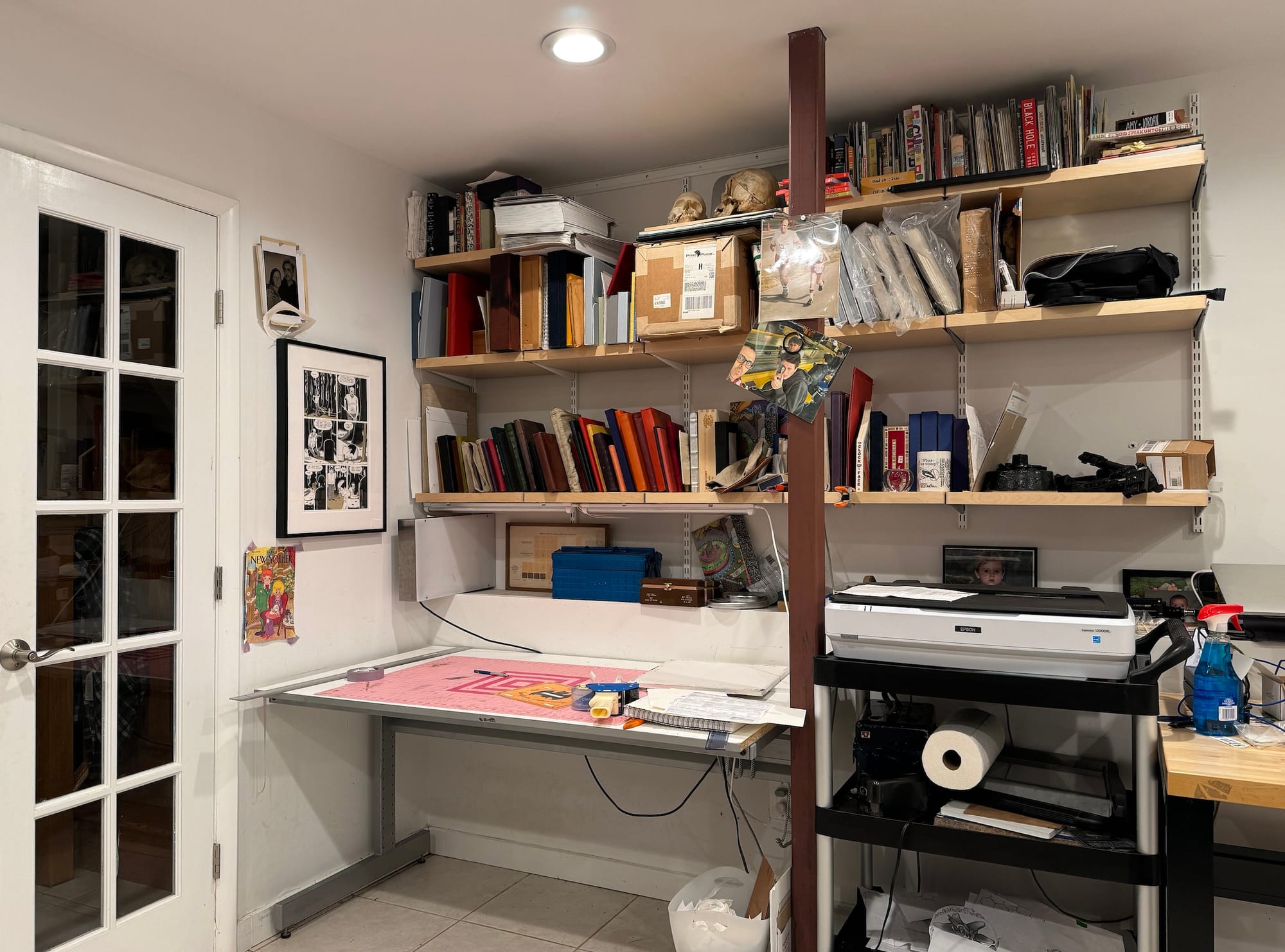 Every day of the week, I dedicate the first hour of my morning routine to drawing in my sketchbook while drinking a cup of coffee. After a run, I move to my studio in the basement of my home around 9 or 10am. Usually, I begin my day with a freelance photo editing task on my computer, which can last anywhere from 30 minutes to two hours. Once that is complete, I transition to whatever project is currently displayed on my wall or drafting table until 5 or 6pm. I also engage in bookbinding and creating unique artist books, which are typically one-of-a-kind pieces.