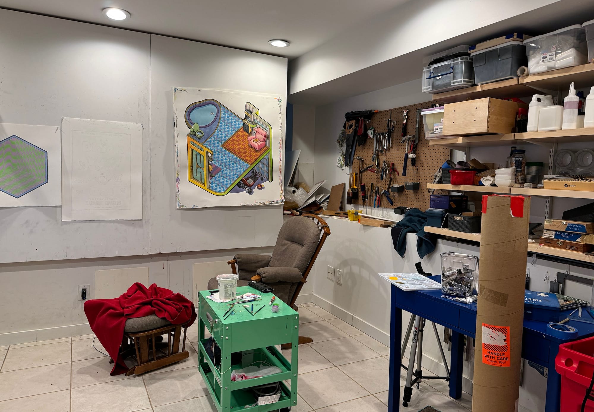 It's in the basement and it does flood occasionally — which I certainly wish didn't happen. I also miss working in the same building as 80 other artists, as I did in my last studio.