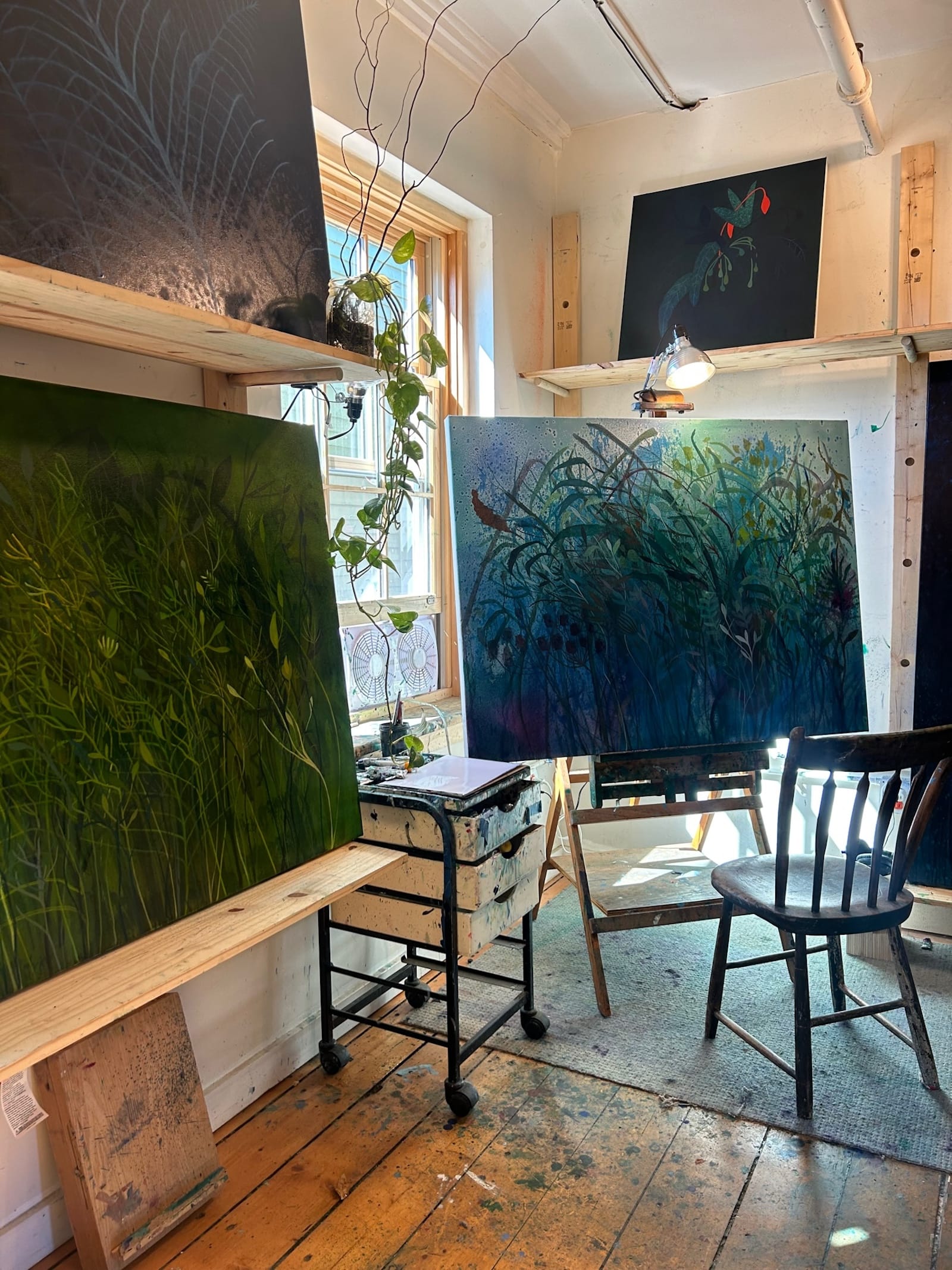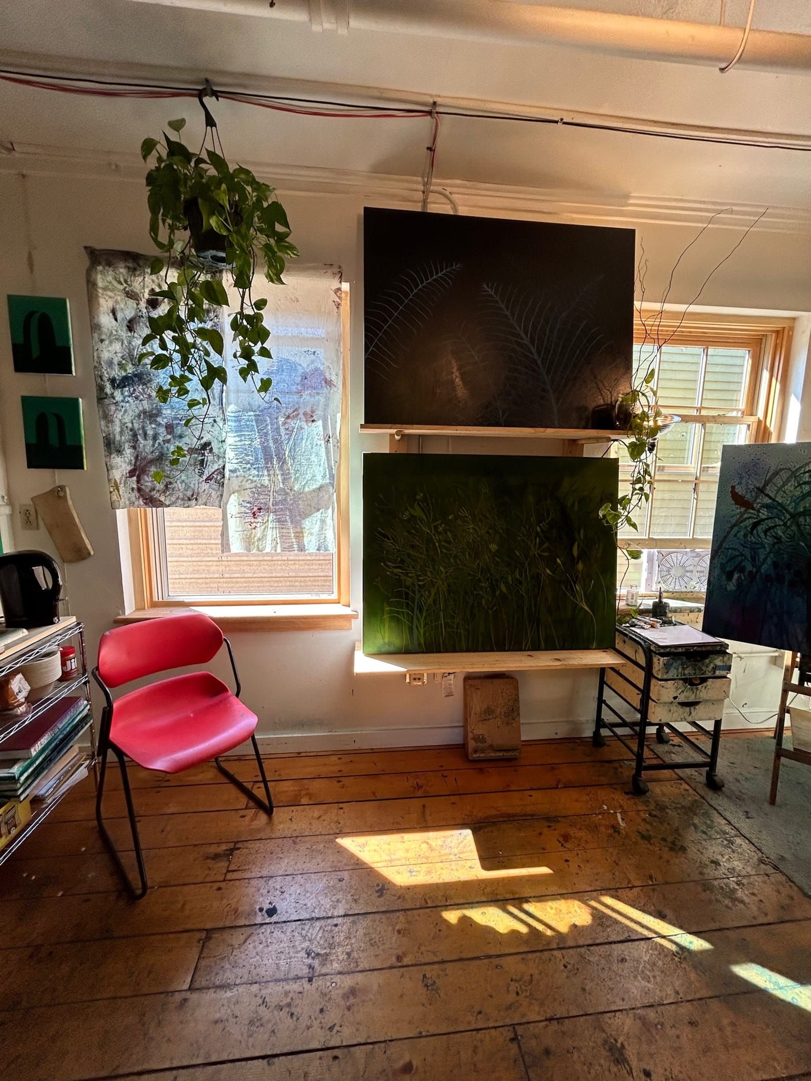 My space is not too big and not too small. It allows me to work smart. I have to be thoughtful about where I put wet paintings, where I am spraying, where finished work goes. It makes limitations that keep me from over-working pieces and stepping on canvases, and in general, encourages me to be strategic. It can be challenging because it is south-facing, but the natural light is amazing, especially in the winter when it's very cold and gets dark earlier here.