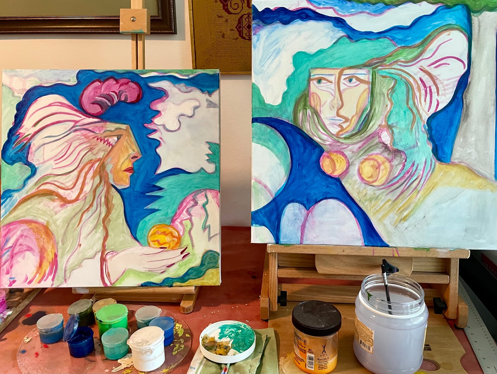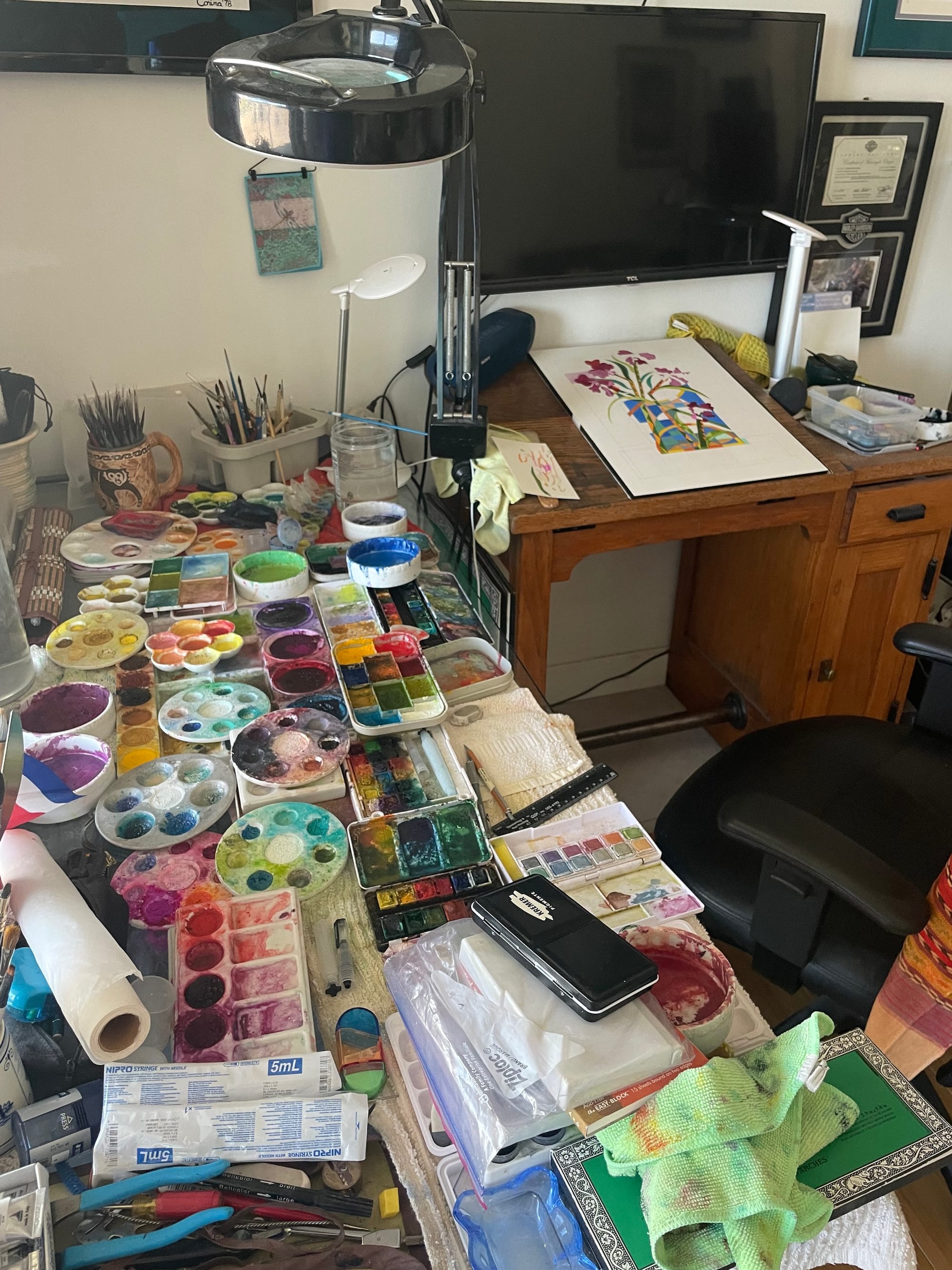 I have three spaces within my home where I work, and I alternate between them depending on the time of day, light, and weather. I work on watercolors in the morning and acrylics in the afternoon, I embroider in the evenings, I work outdoors when it’s not hot and humid.