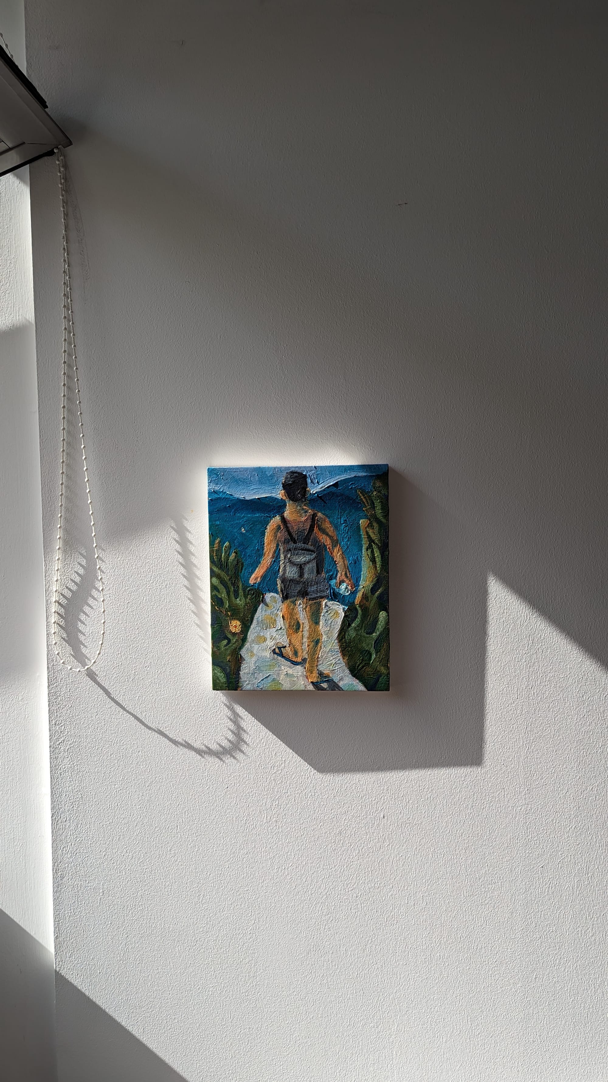The first thing I do is make a large pot of coffee. I'll open the window, open my laptop, and play some music. I'll look at what I did the day before and think about what I'm in the mood to do. This usually means drawing, or if I'm on a roll from a current piece, I'll continue with that. I scatter my drawings on the floor and shuffle through them when I'm looking for new ideas. Some days I get in an artistic flow and work nonstop, others I wait for hours before something sparks. Normally this leads to a quick burst of fast-paced painting that can either feel incredible or disastrous. I work best in the heat, especially when I'm sweating, so I like to work in nothing but underwear and Havaianas. I would work naked but the flat across the road can see into my studio. When my brain needs a break, I go to the laptop and do some admin, apply for opportunities, email, etc. At the end of the day, I roughly clean my brushes by wiping them on the wall.