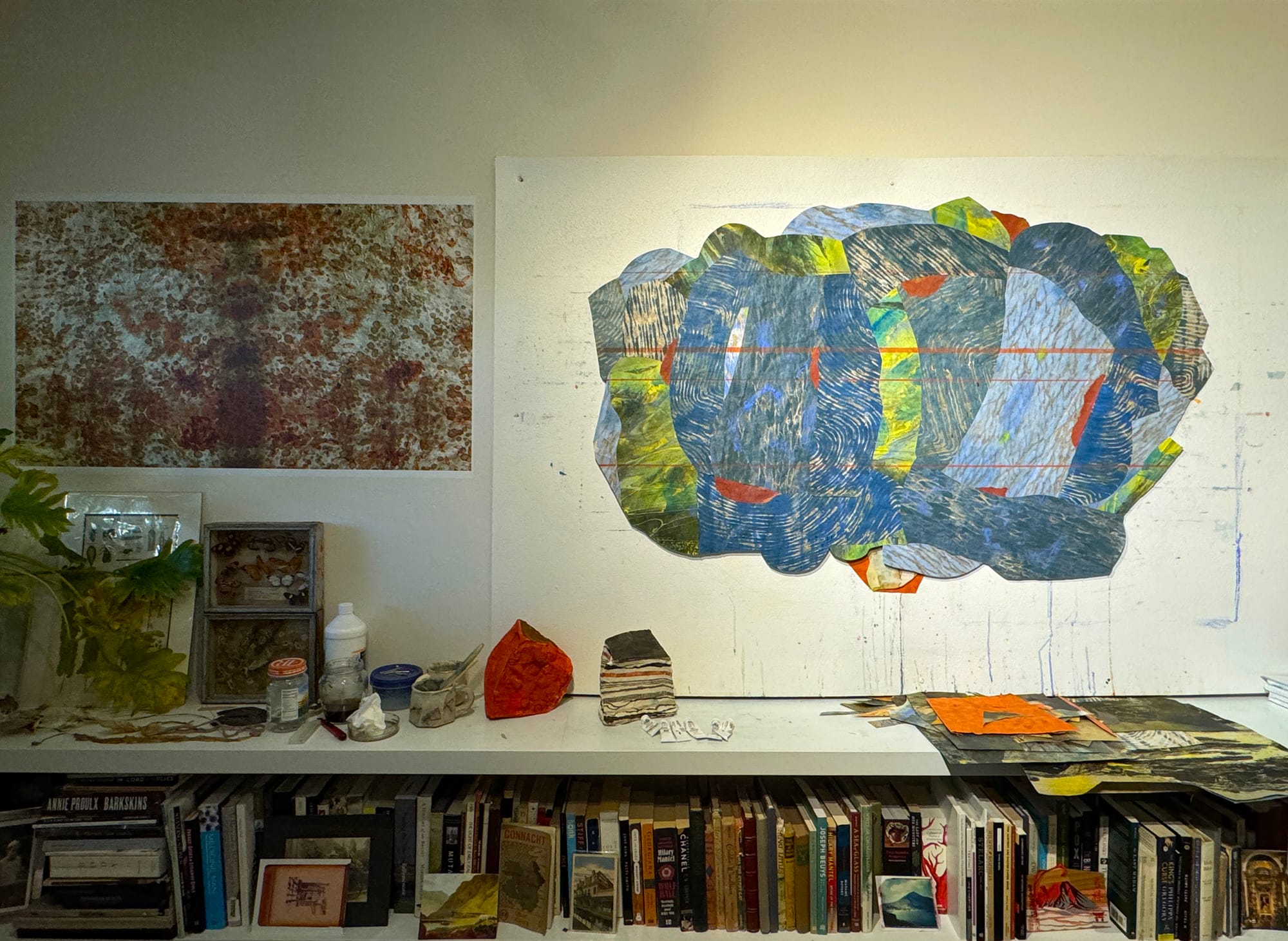 My studio is in my home, so I like to stop in to look at my work between other things that I have to do during the day. I'm usually most productive in the afternoons and work on several pieces at once. I use photographs in my work, so some of the time is spent taking pictures and experimenting with printing and painting on different papers.