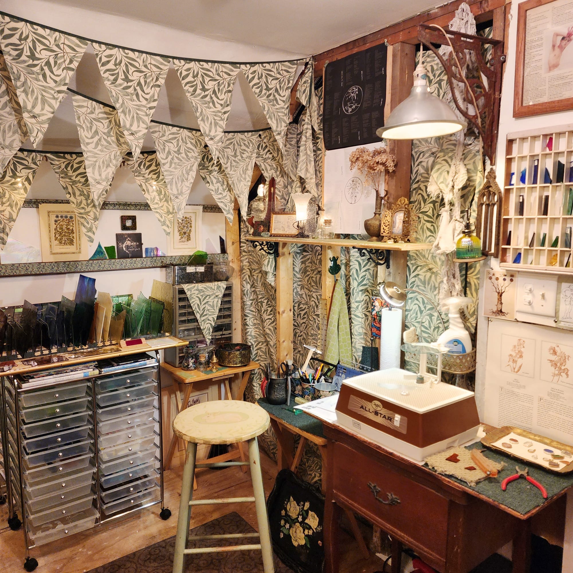 Large enough to have separate areas to work in metal and glass, and even a small closet turned into gallery space. I love the serenity of being surrounded by trees and nature's peace. The inside is a bit maximalist, as I am like a bowerbird, surrounding myself with thrift store finds and tag sale rescues. And lots of green.
