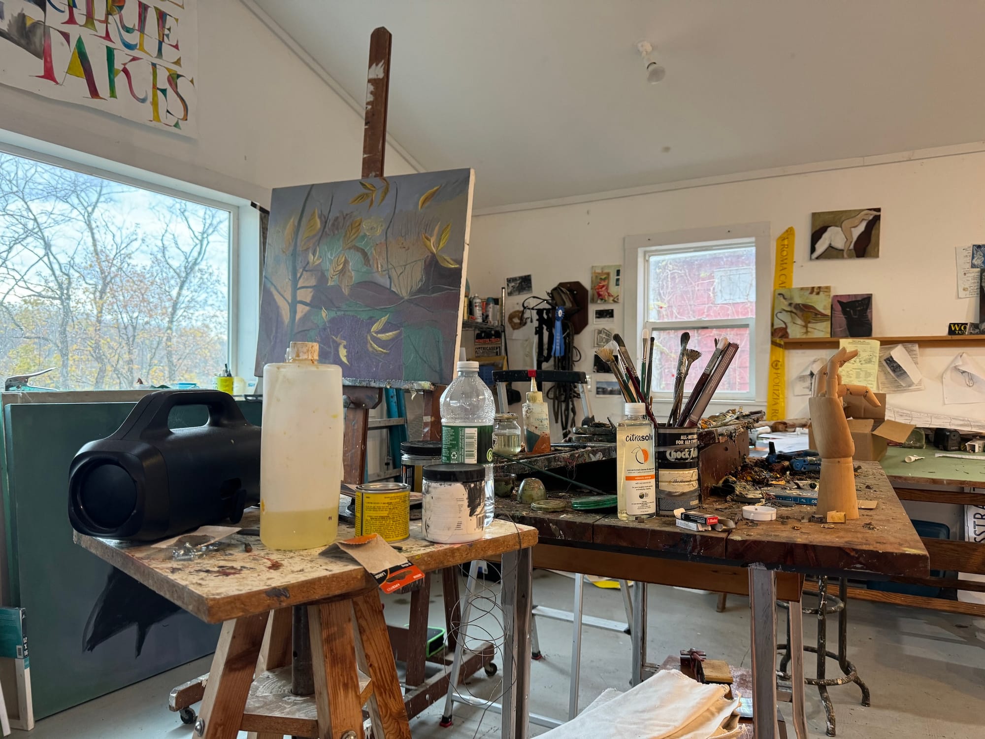 I am in the middle of a hemlock forest, beside a stream. Nature is ever-present, out every window. As a member of the Hilltown Arts Alliance, we gather to support each other as rural artists, and hold a yearly Open Studio Tour. Not as isolated as we had thought before moving out from Boston, grateful for the rich art and music communities in Western Massachusetts.