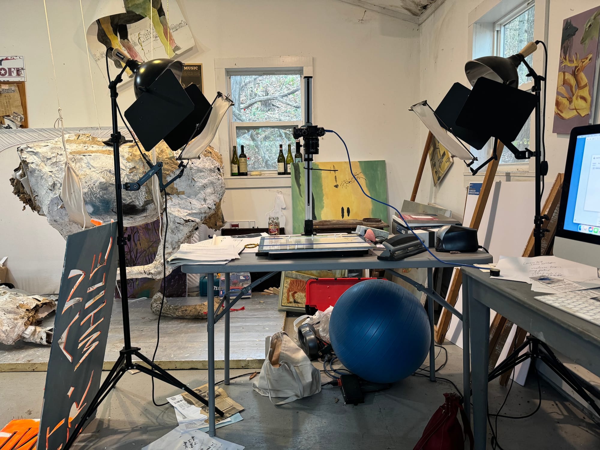I've accepted the limitations of a 20-by-22-foot workspace. I paint big! But it's so great for animating. When the weather is fine I leave all doors and windows open. Animating is best done at night, because I fixed my pan lamps to a pedal and I only stomp on it when I want to blast the room. If it's dark outside there are fewer inconsistencies in the exposures to deal with. (I use Dragonframe.) I make short animations about music, always with the permission and/or encouragement of the musician(s). As a musician myself, I go deep into the rhythms and colors, and especially the meanings, of the notes. I love to animate singing. Singers are from somewhere else!