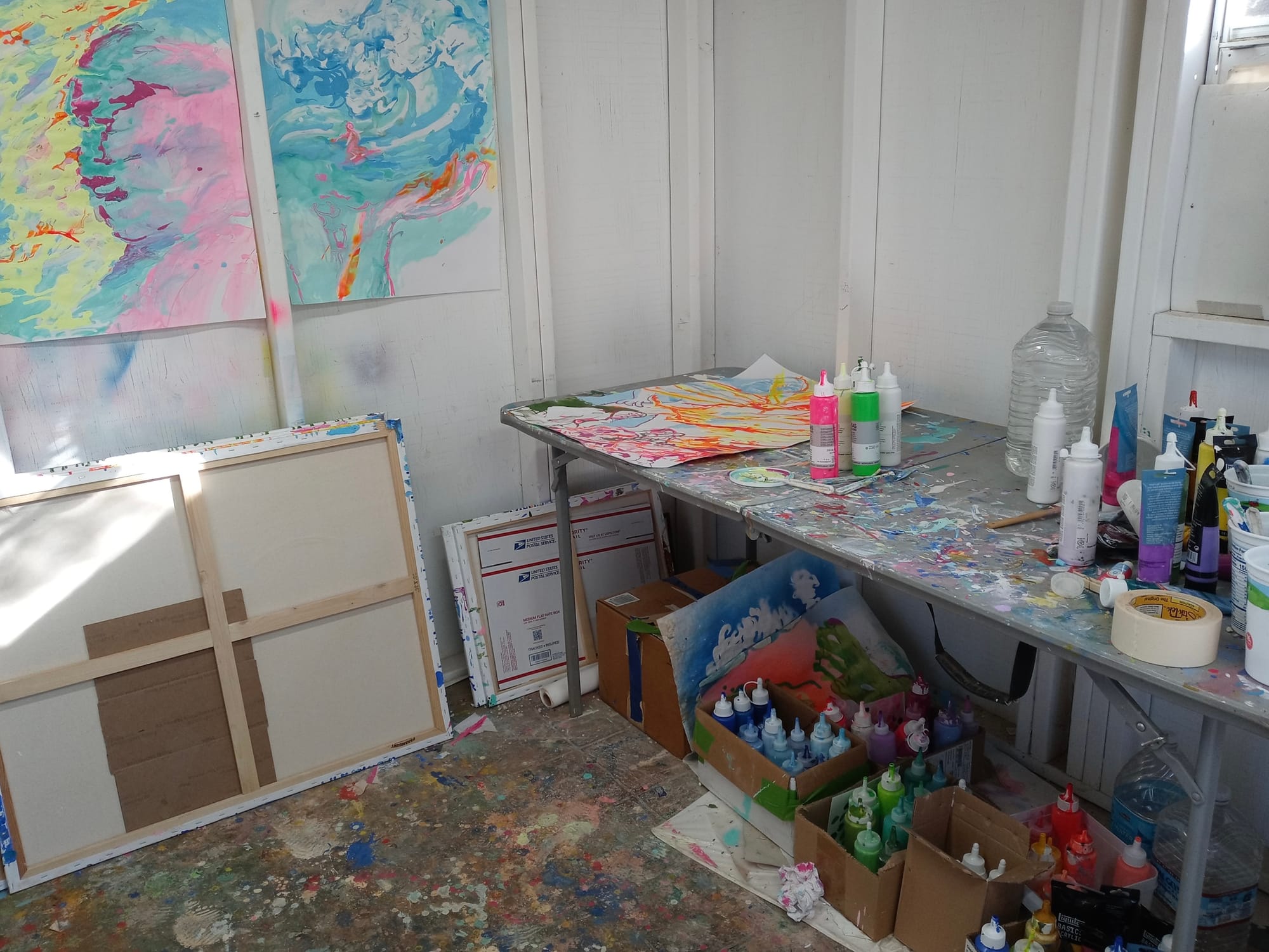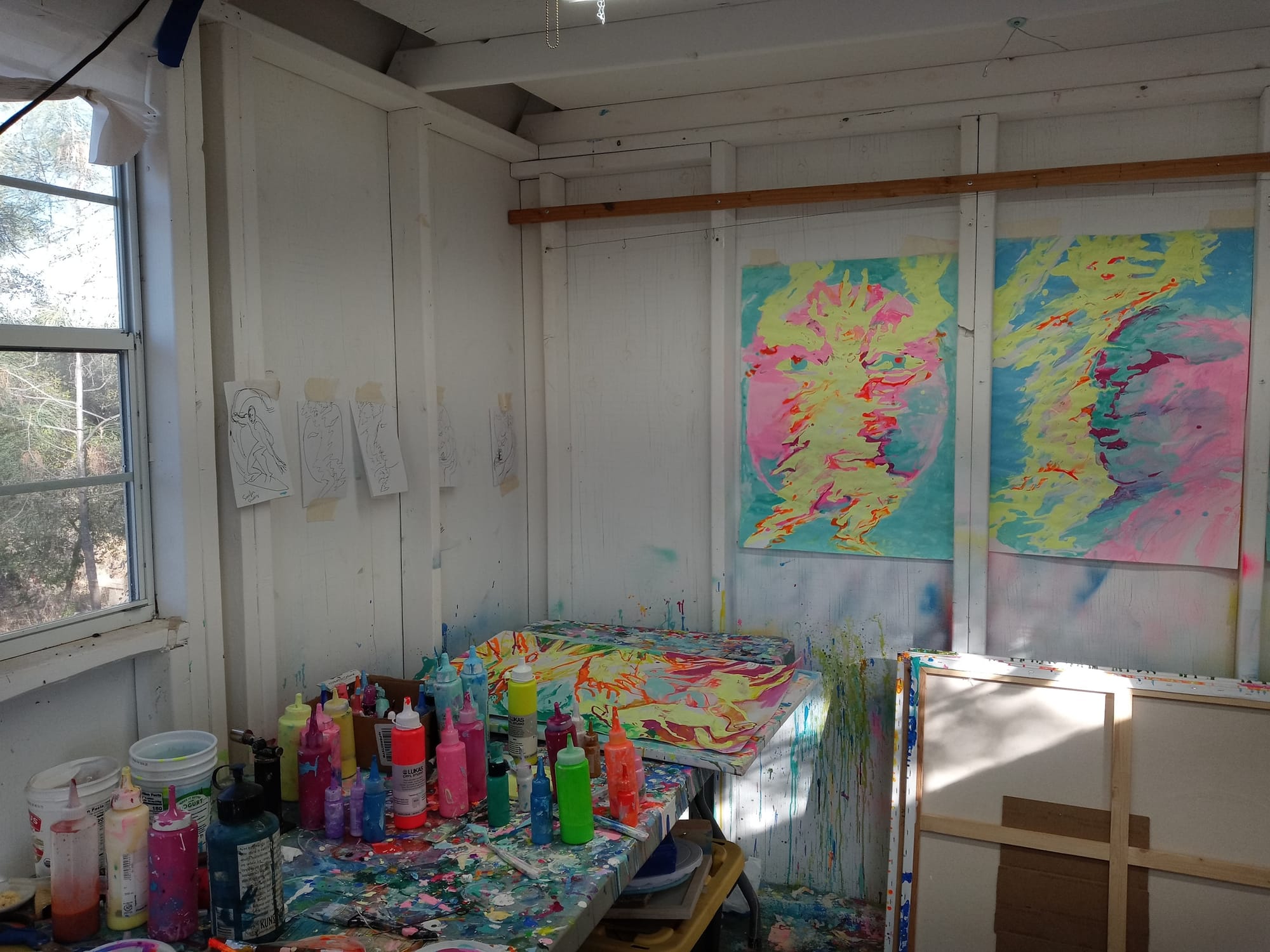 My space is small but I love it. I work on larger canvases by putting them outside on the ground.