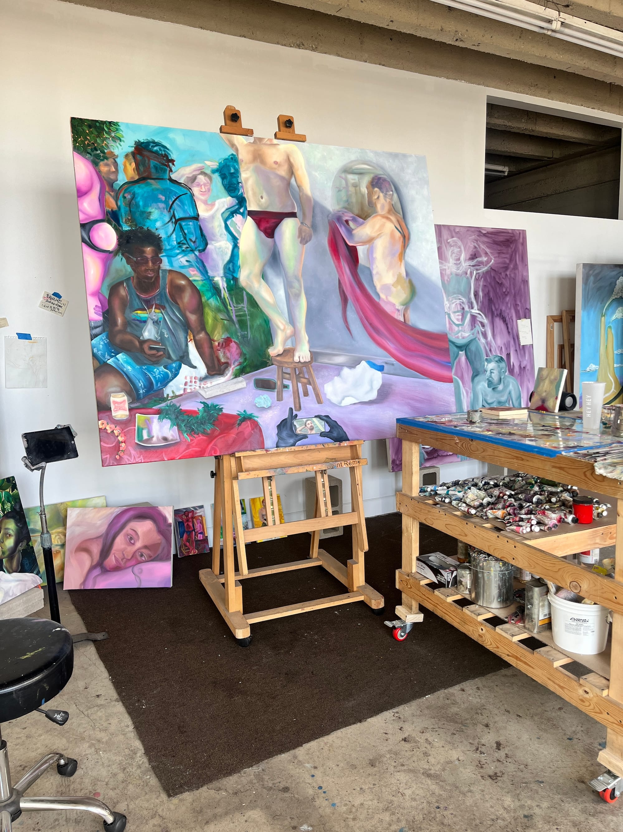 My studio feels like home to me. I’ve set it up so that it feels cozy and I can take breaks, which helps me feel more relaxed when I paint. I’ve got three large windows and the LA sunsets are always amazing colors that I love seeing next to my paintings. The light in my studio plays a big role in how I formulate light in my paintings. There’s also a fire escape that looks out onto the mountains, which is very inspiring.