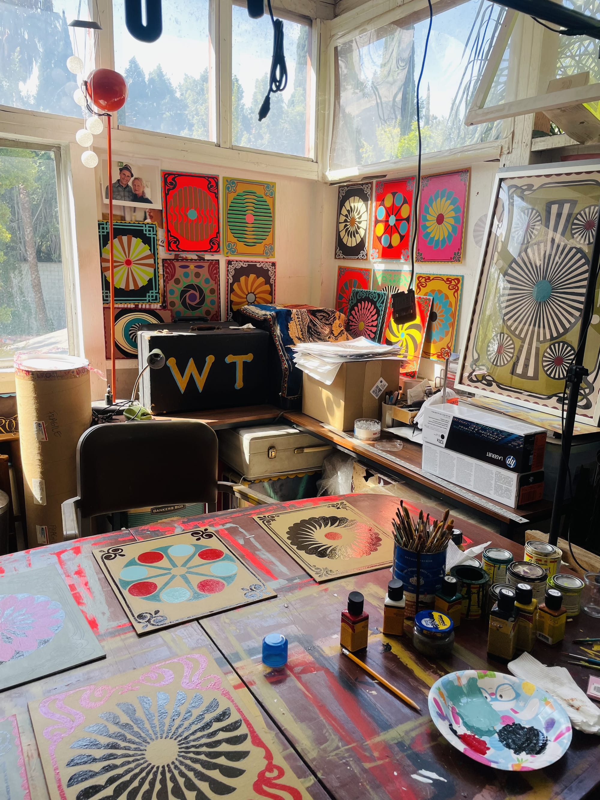 I usually begin work around 8:30am because the morning light is so beautiful at that time. My studio is in an enclosed porch that's attached to my house in Hollywood. I share it with two rabbits who lie at my feet while I paint. There's lots of windows that let in the sun. I usually work in two- or three-hour shifts, tackling other projects in between sessions. Since I use enamel paint, I almost always have multiple pieces going at the same time because the drying time is so long. Plus, I find that each piece informs the other, so there's a nice interplay. I almost always listen to KXLU, a local Los Angeles college radio station, but sometimes I listen to podcasts or playlists. It just depends on my mood.
