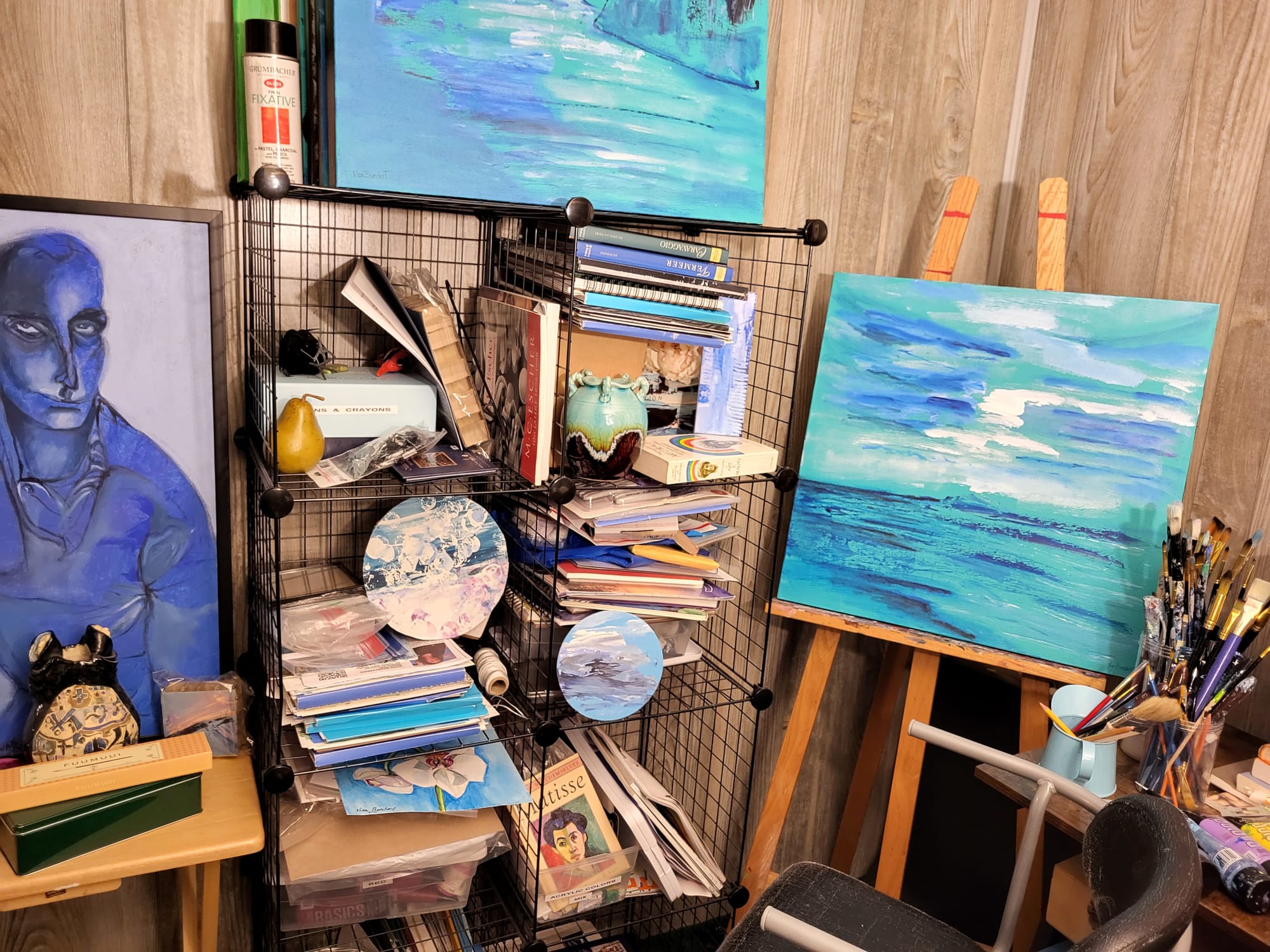 I like that I have all the needed materials within my studio. I hate running out of materials while still in the midst of working. I have a good amount of paint tubes and brushes to sustain my painting process. I also like that it is a quiet space where I can reflect and revisit my ideas about my painting projects. My studio, in a sense, is an escape where I can re-enter my art world and create.