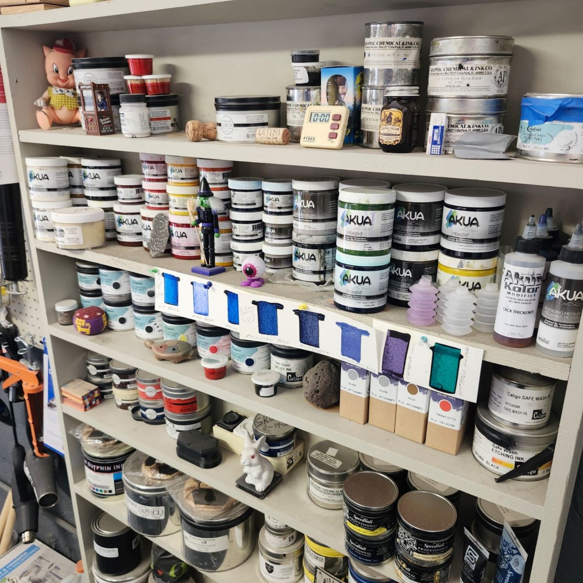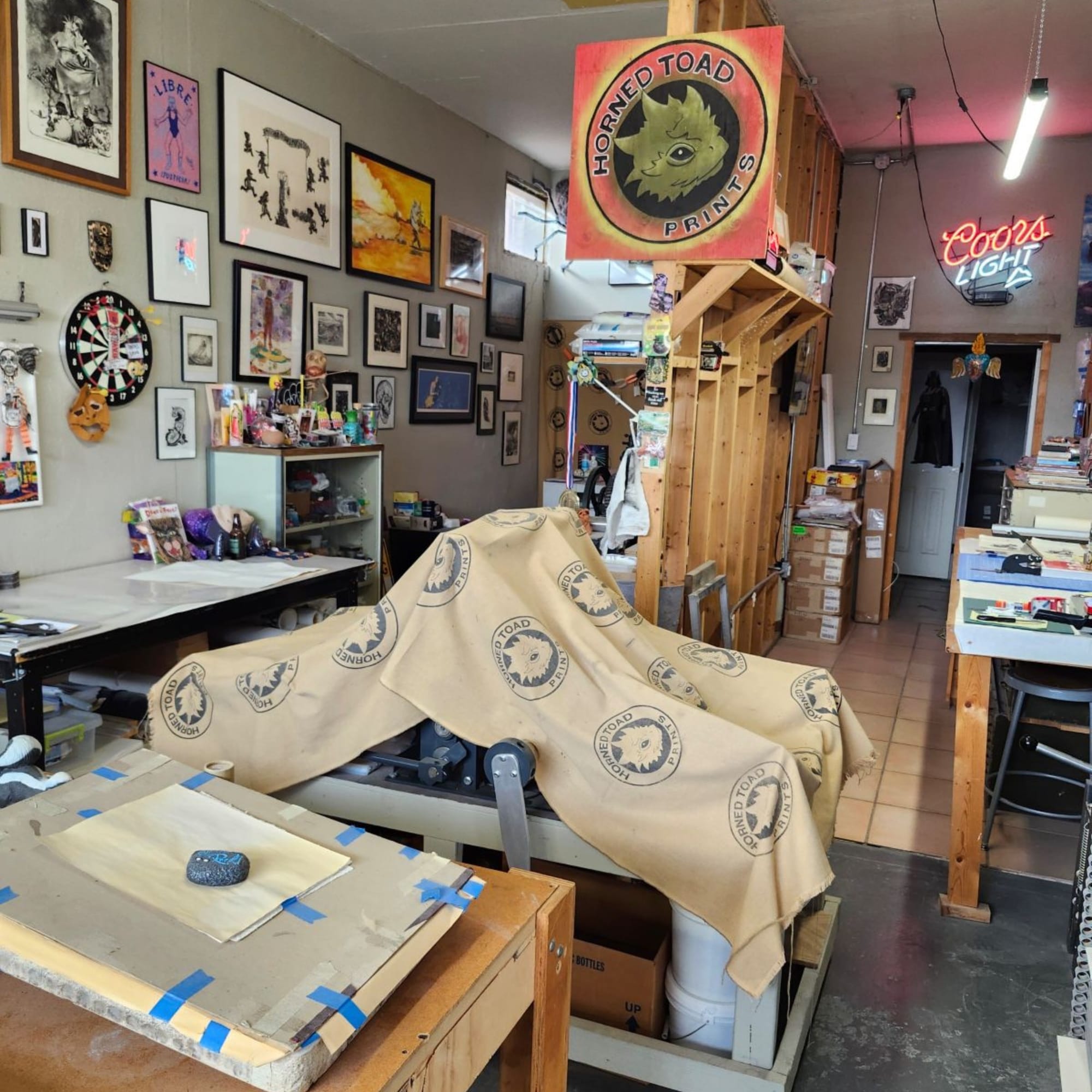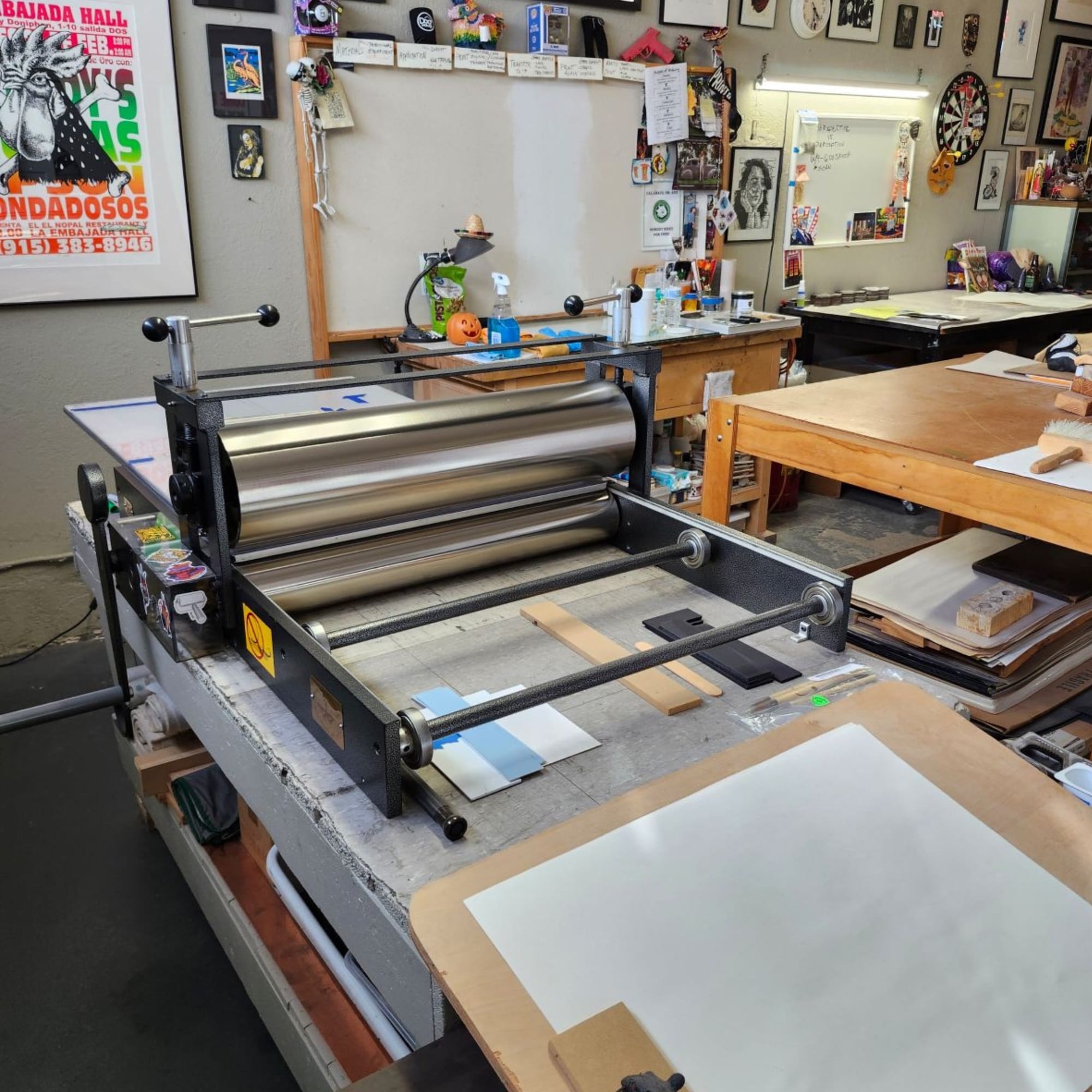I have several examples of prints on the wall from artists I have collaborated with or who have donated to my shop in friendship. My presses, inks, and materials as well as the location of my shop are an inspiration. The atmosphere and energy in the shop is always welcoming.