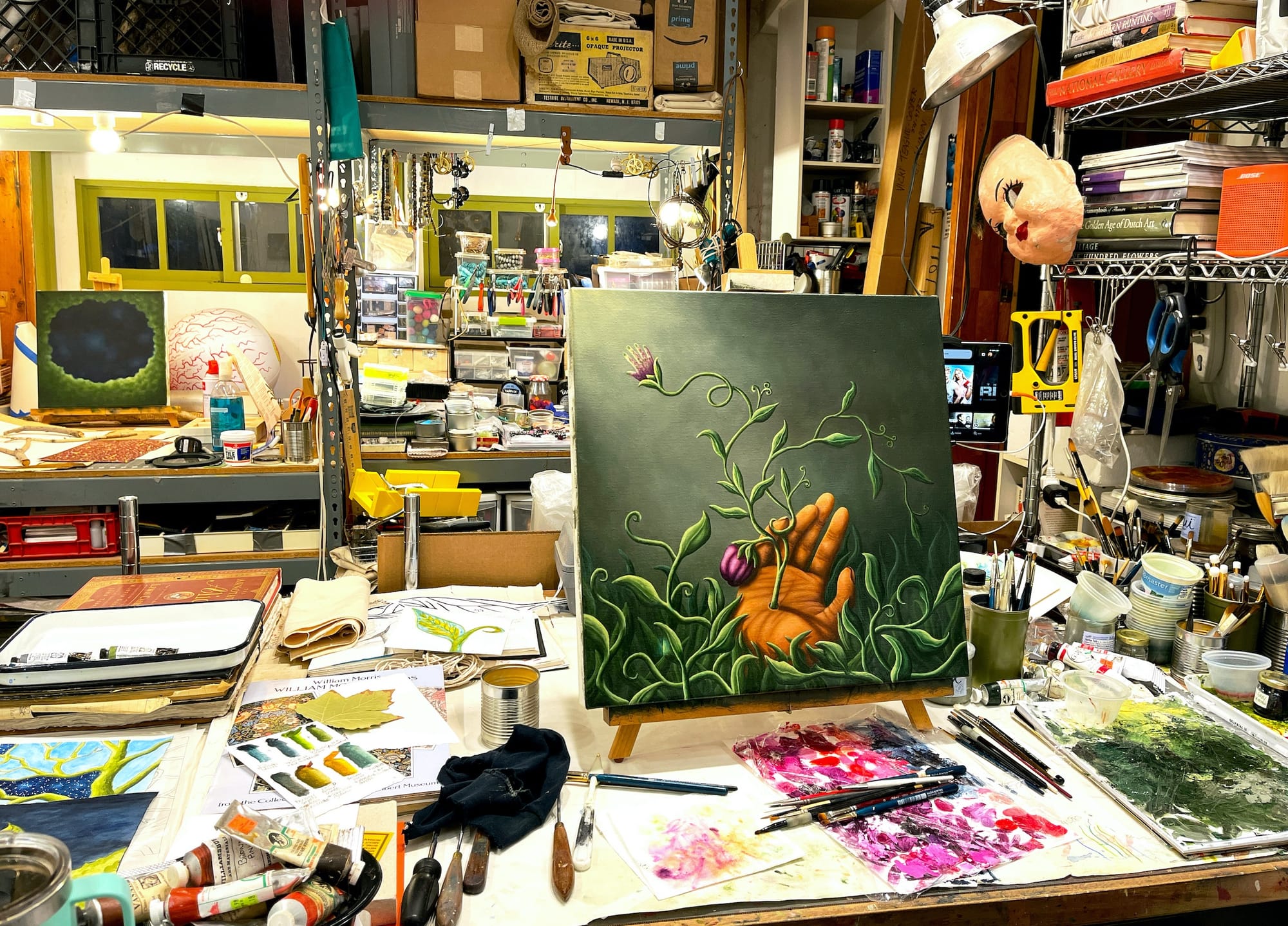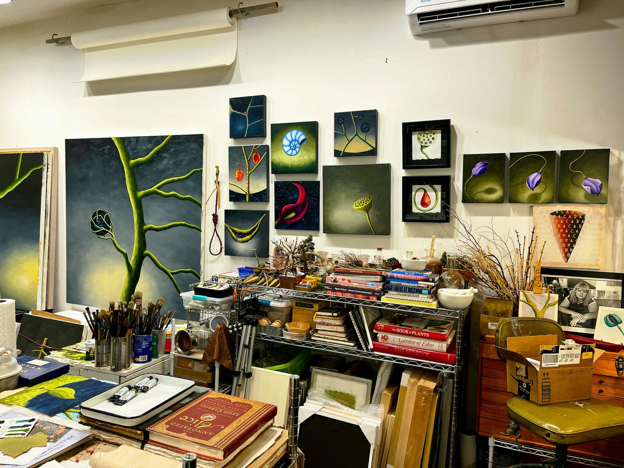 Welcome to the 269th installment of A View From the Easel, a series in which artists reflect on their workspace. This week, artists turn to their garden for inspiration and work as a duo on translating digital works into paint.