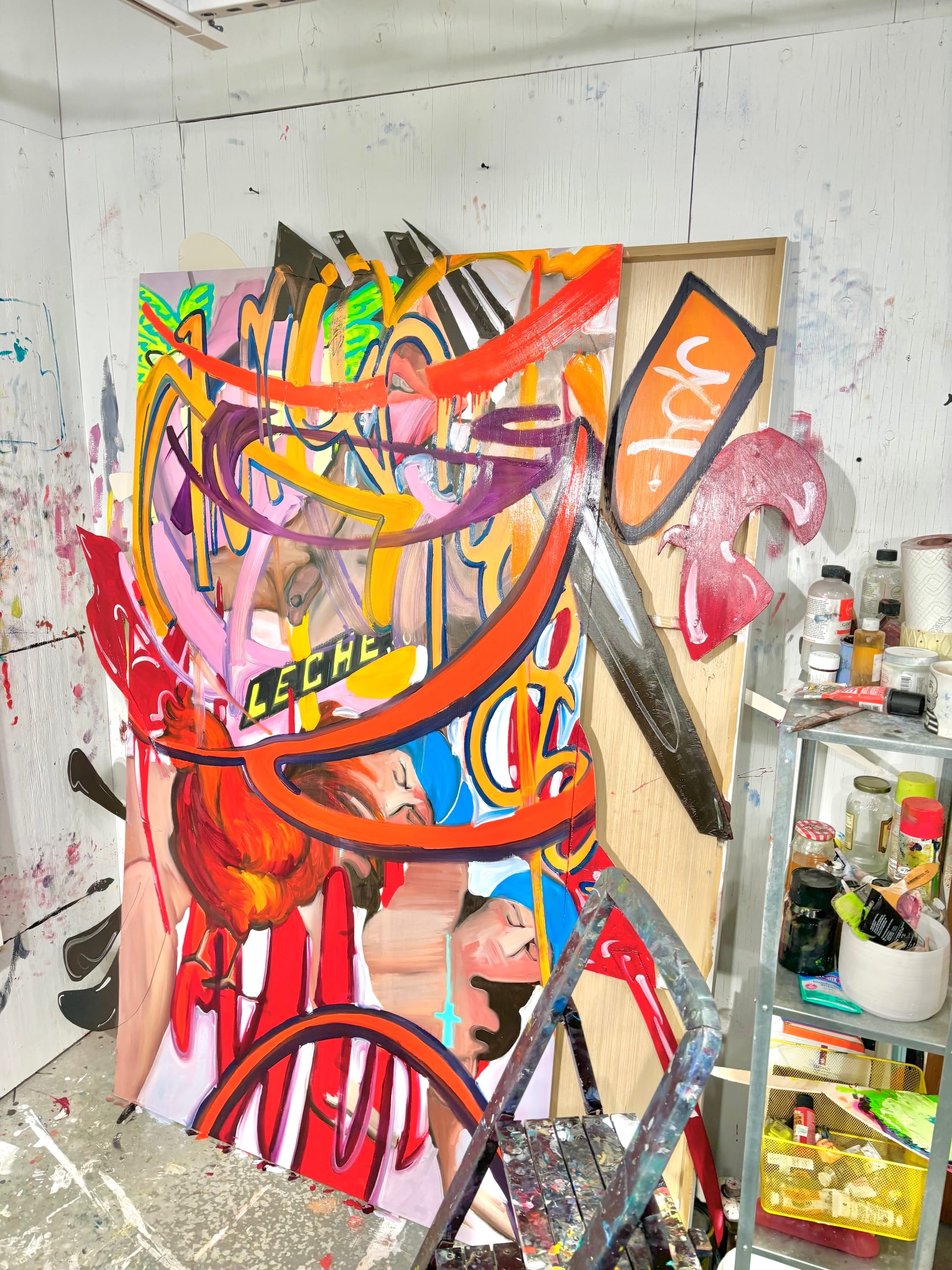 Music is a non-negotiable aspect of my studio practice. I feel like music is a medium I understand on a spiritual level — like I can feel everything the musician or DJ felt at the time of inception. I think this attraction to music originated in my childhood, as I grew up Protestant and without the "traditional" Catholic imagery people think of when they think of Latino America. My daily routine varies, but generally I begin my day with a cup (or two) of coffee and then proceed to look at my digital calendar. I like to think I'm unorganized, but really I try to plan my week ahead of time. I don't have a car, either, so my purchases must be intentional and feasible with a bike, and I grew up very resourceful. My studio practice reflects that resourcefulness, that need to search continuously for inspiration or for new materials that challenge me. Though my week can be pretty planned, my days are full of spontaneity and I almost never allow myself to sink into the feeling of guilt or shame about not getting enough work done, which pushes back against the American work ethic. If things happen, they happen, but if not I make up for it somehow. I "clock in" to my studio usually in the afternoon. I love staying up late and waking up early, but having both is unrealistic for my mental health and I normally think best after 12pm. When I'm not in my studio, I think about my space, about my paintings, about the imagery that excites me and makes me want to return each day.
