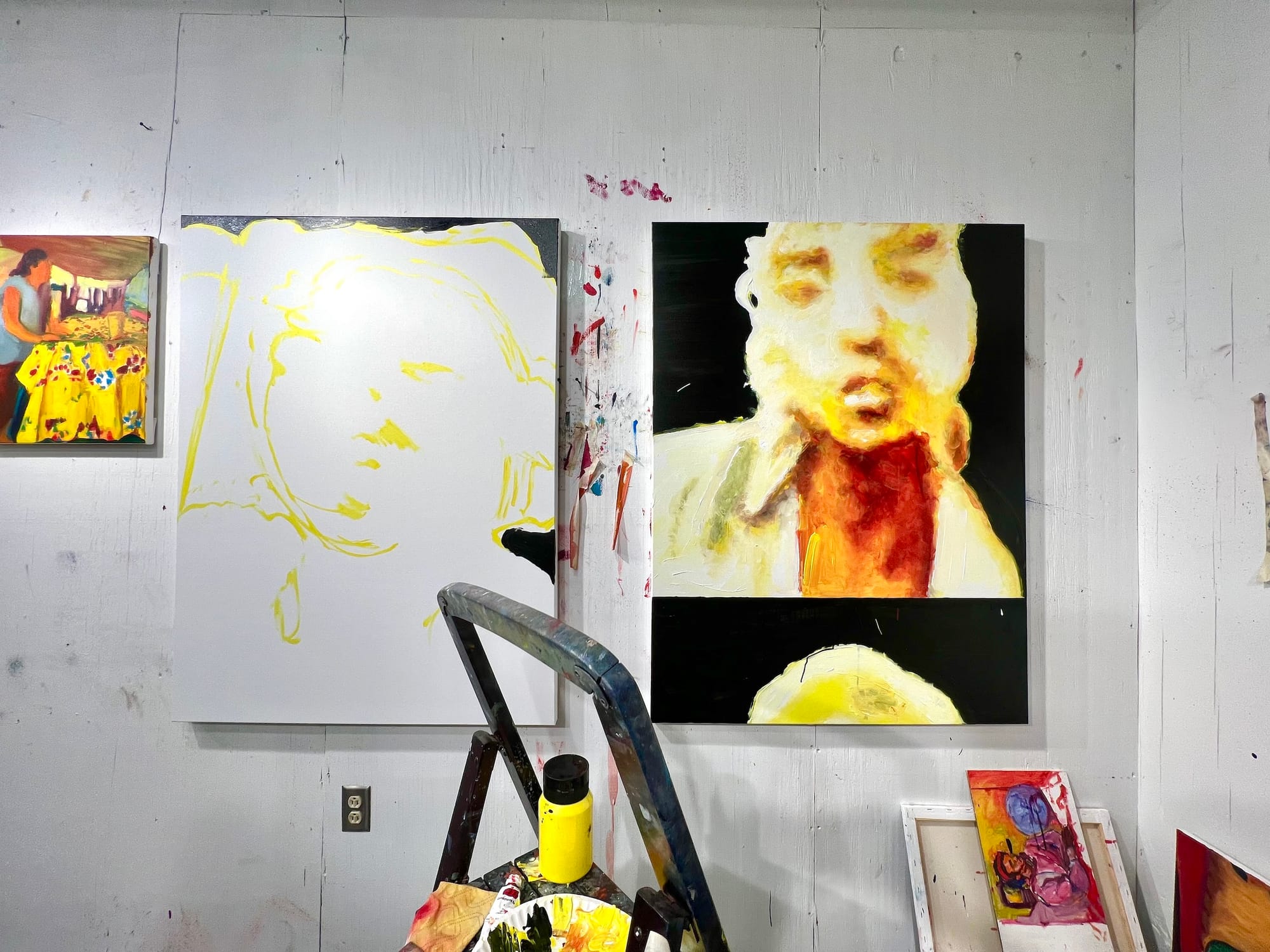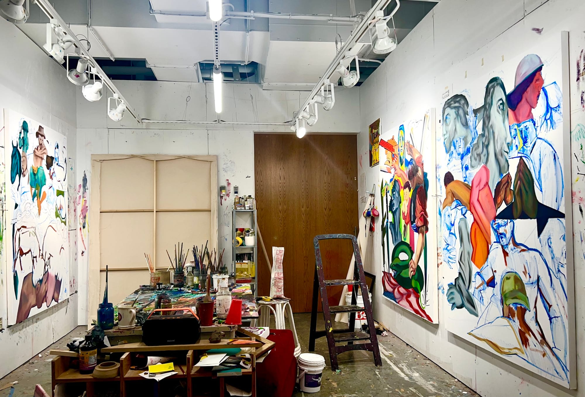 I love my space deeply. I remember when I first stepped foot into the white-walled studio. It felt empty without paintings on the walls, but I knew that would change quickly. My setup has changed at least once a year, or sometimes every semester, and there is currently a large clearing in the center of the room for the foam paintings I'm developing. My studio gets quite messy, but I thrive in that chaos and I know where everything is intuitively, from that small X-Acto blade to that shriveled-up tube of random paint I've had for a decade. My palette has a large build-up of space, but I somehow see right through the gunk and make my color decisions based on sight and speed. The chaotic energy of my space reflects the multiple directions I'm consistently pulled in and helps me experiment freely without judgment, but with refinement.