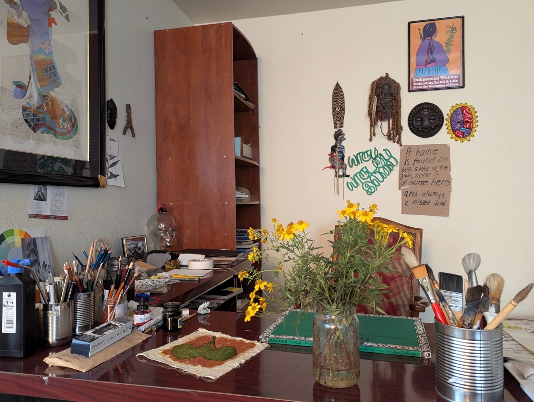 Ink, gouache, graphite, other dry medium(s), paper, fabric, and plants.