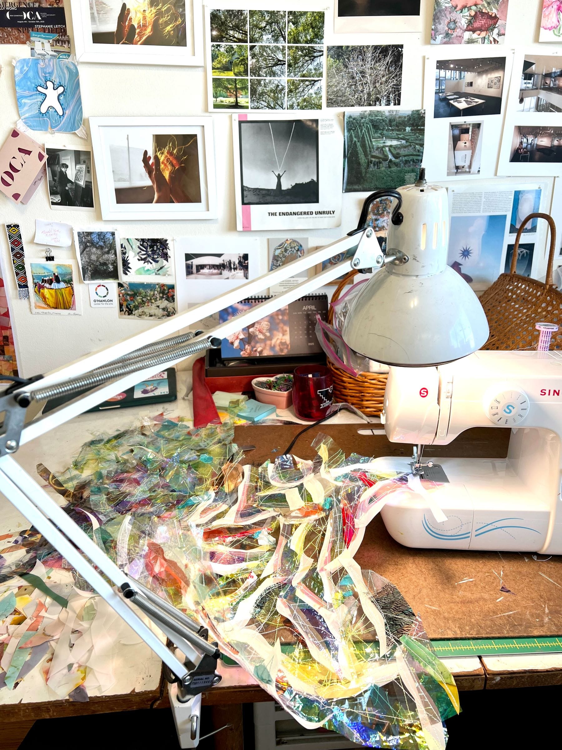 I love working with dichroic film and silk organza. The light reflective quality of these materials is so inspiring to use in my fiber installations.