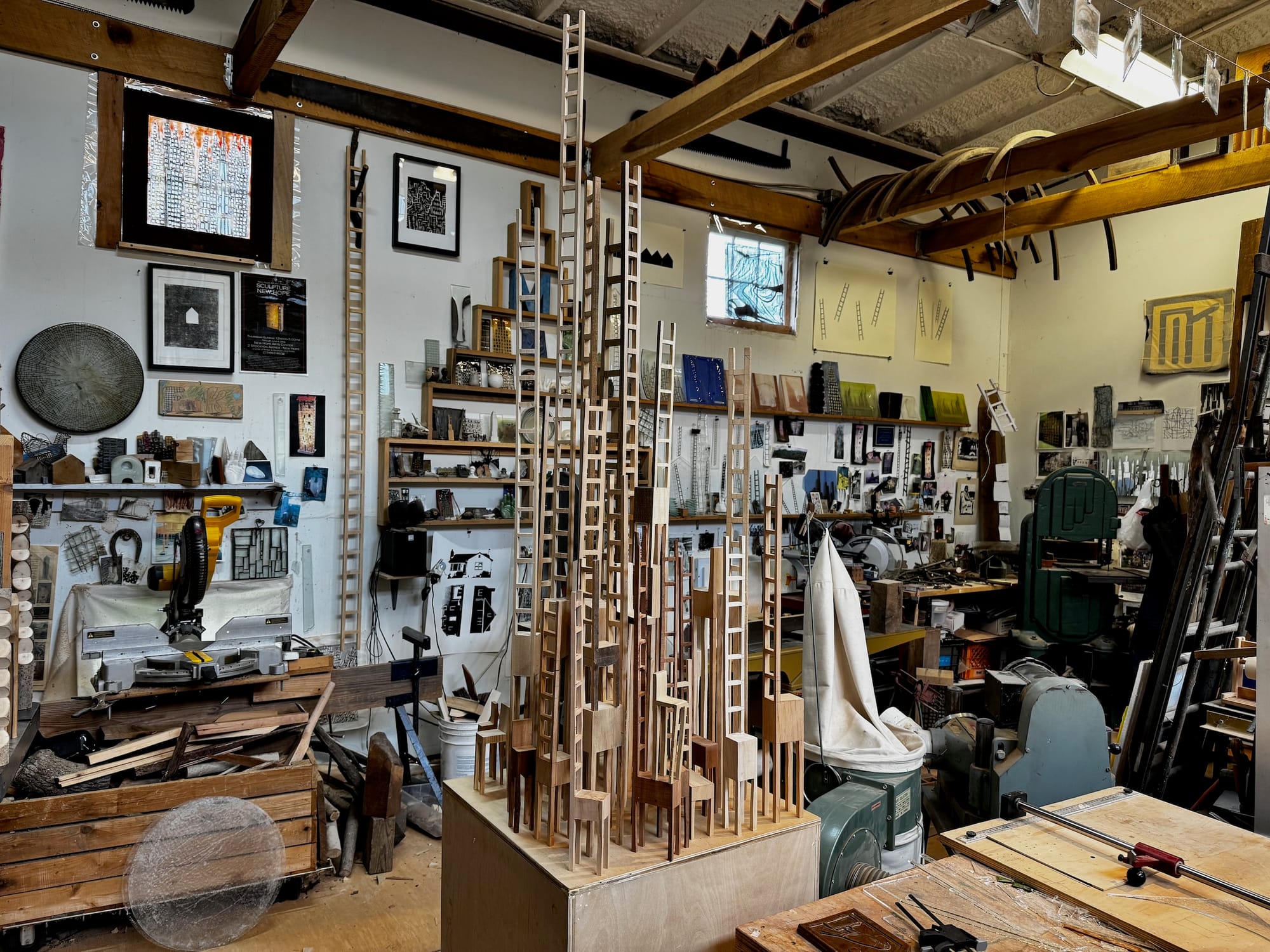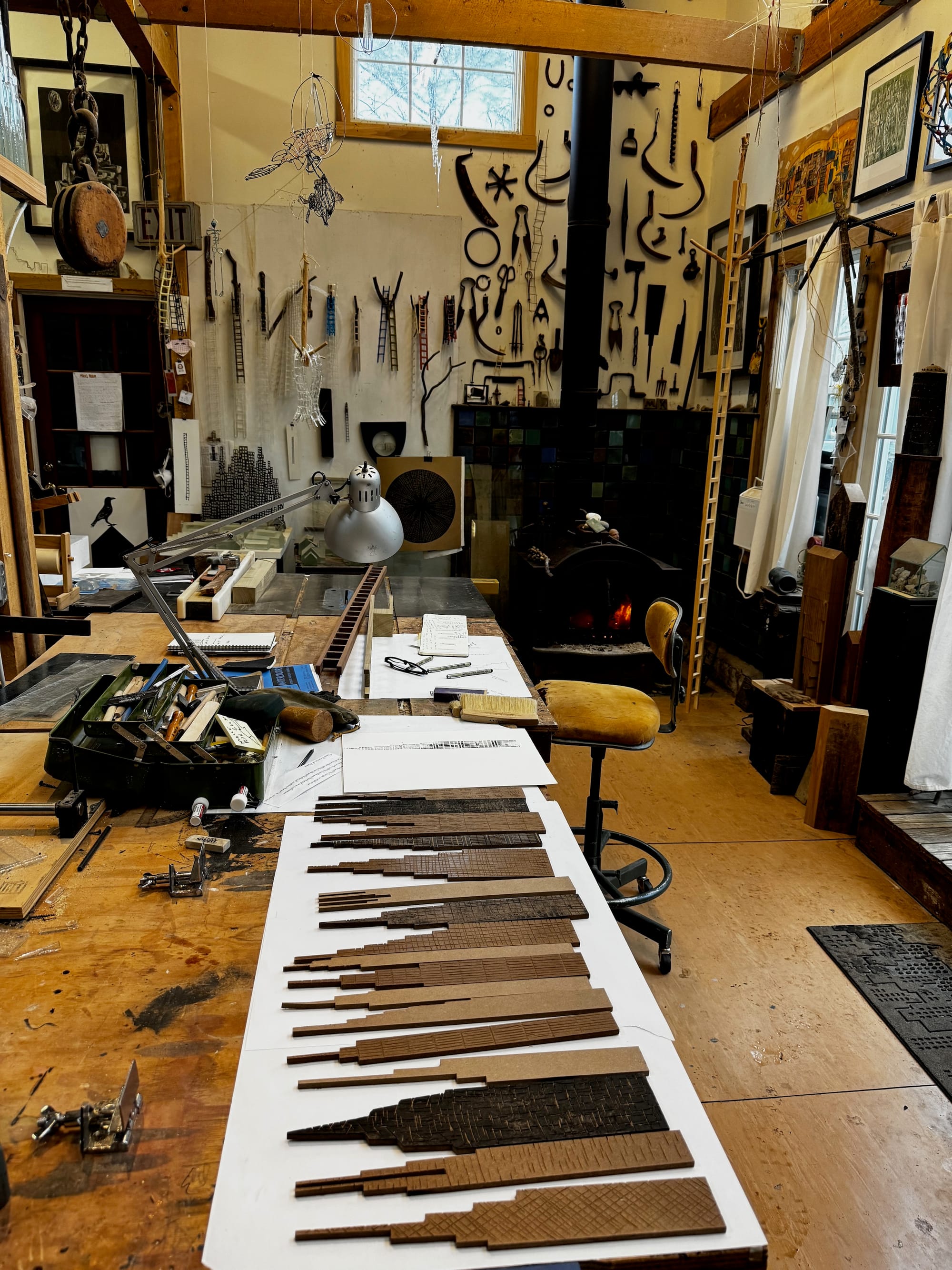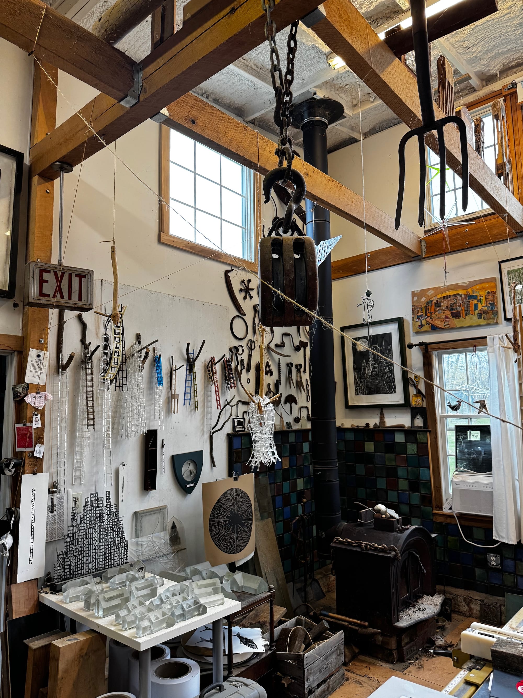 I designed and renovated this building after my last studio on the property burned down. I wanted a timbery space full of light. I love the fact that there are a lot windows in all of the three rooms, granting me light, my favorite element of creativity. My college work started with photography and evolved into working with glass, both light-dependent mediums. I have a tall ceiling and the studio feels very spacious. I have many things hanging from the ceiling along the beams and walls. I am also most fortunate to have another structure to store my wood/lumber and other studio essentials.