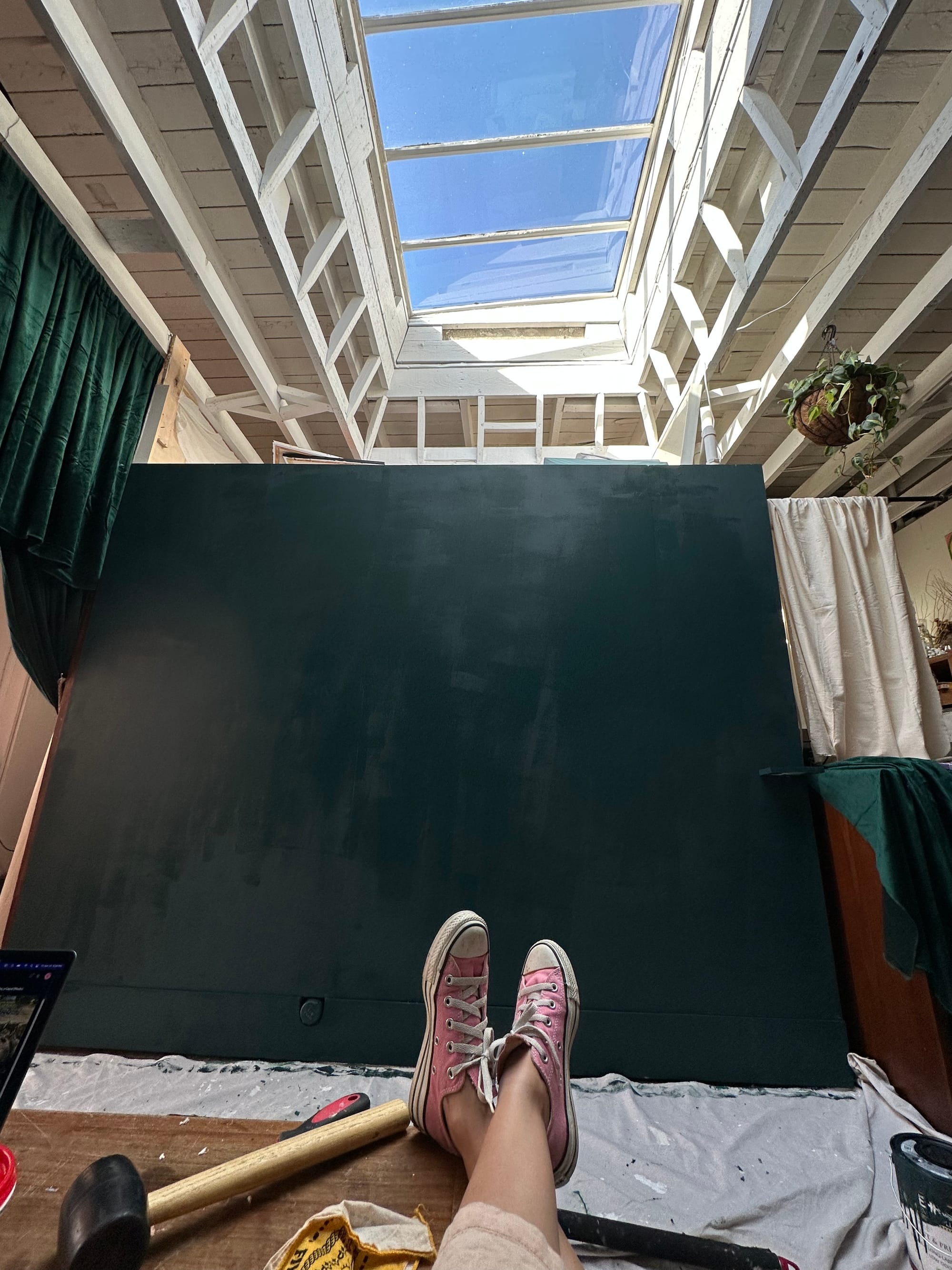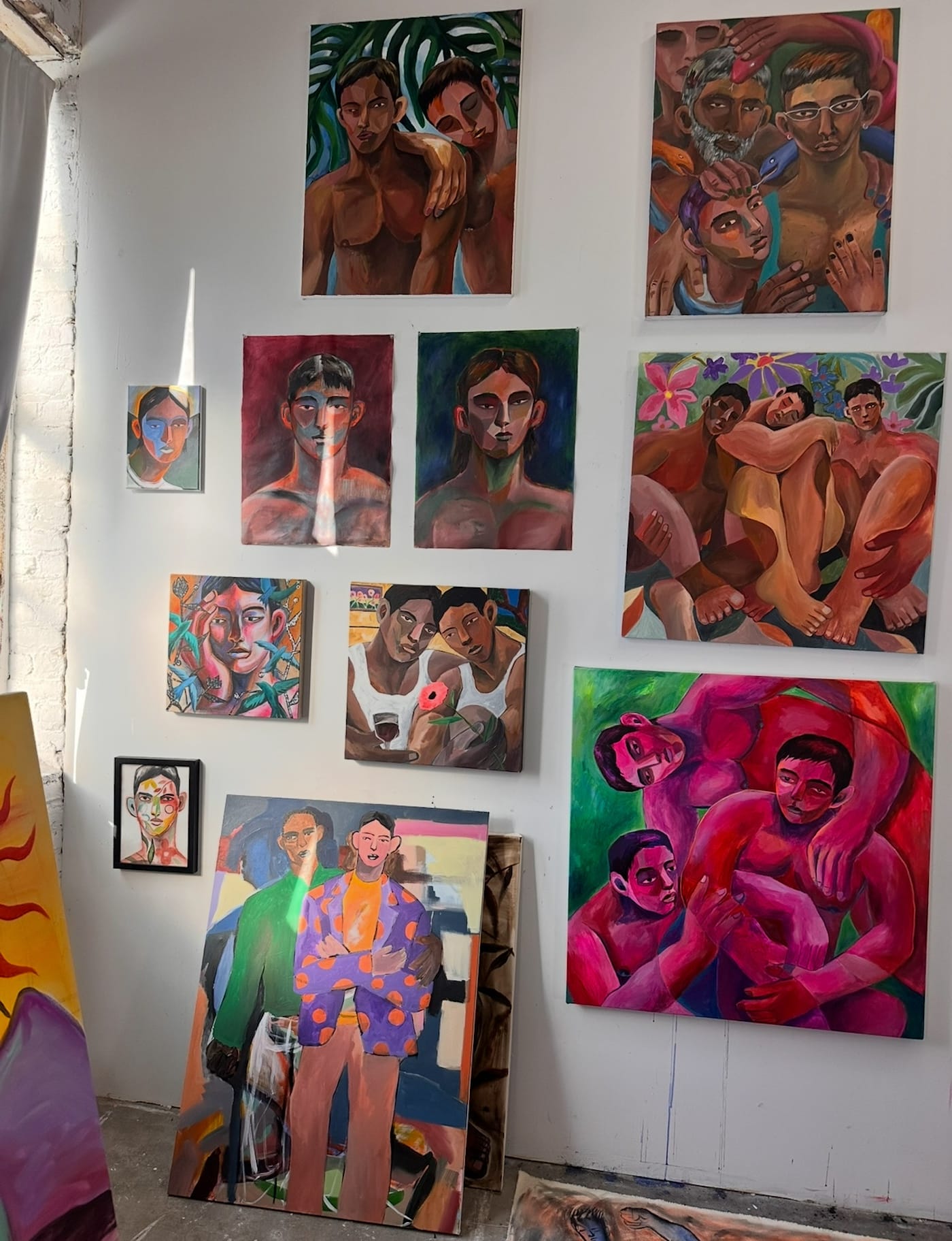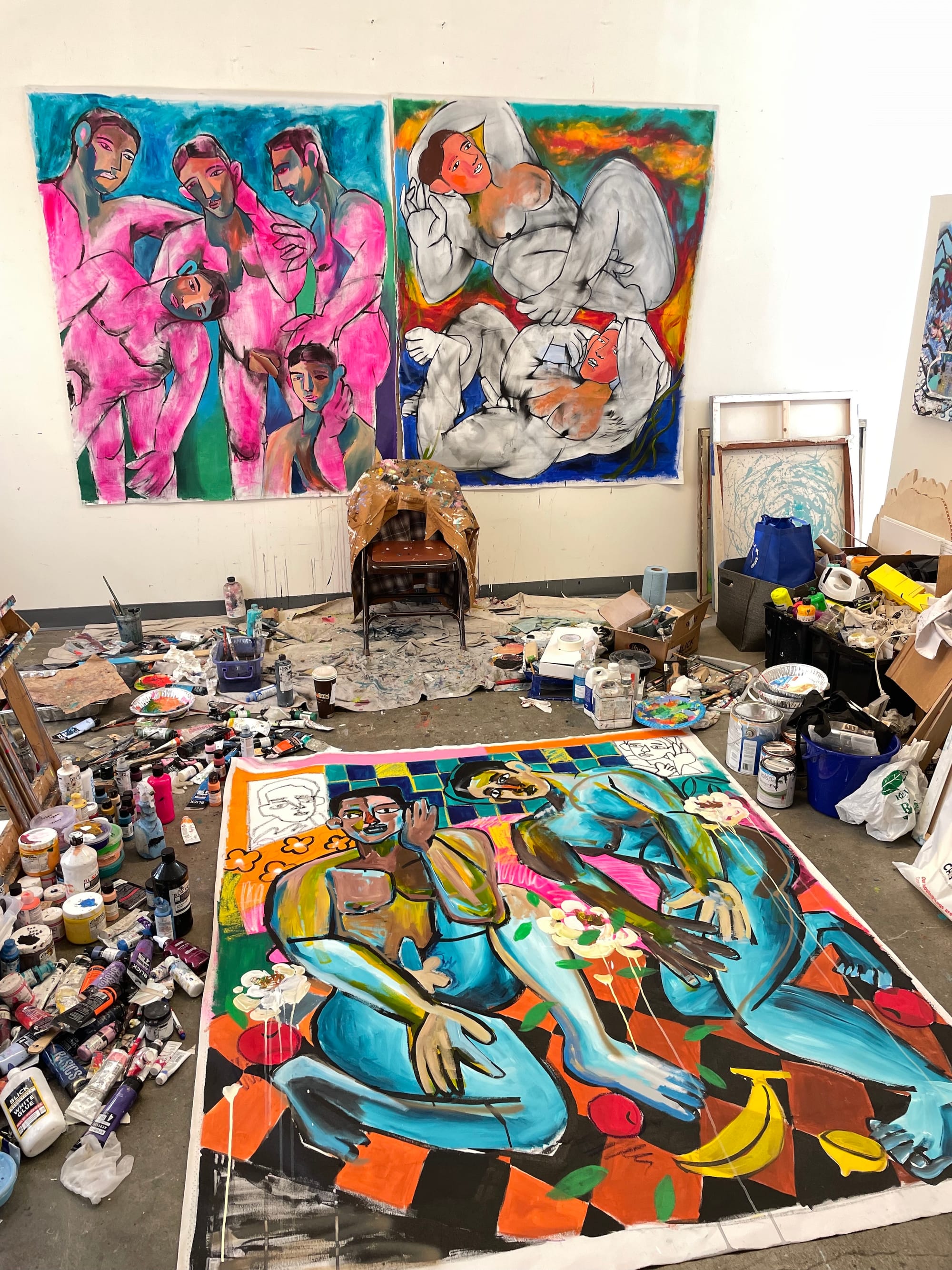 My studio is messy, with canvases stacked and materials scattered everywhere, but it feels vibrant and full of life. Large unstretched canvases, brushes, and fabric fill the space. I often hang pieces or paint directly on the walls, and the floor becomes my easel. There's a large window that looks out onto a Japanese maple tree in the garden, and watching it change colors with the seasons is really grounding and meditative. On late afternoons, natural light pours in through a skylight, sometimes creating soft rainbows across the studio. It lifts my mood and gives the space a more queer and joyful atmosphere. Having a private studio is essential for me. It allows me the focus, comfort, and freedom to fully engage with my work.