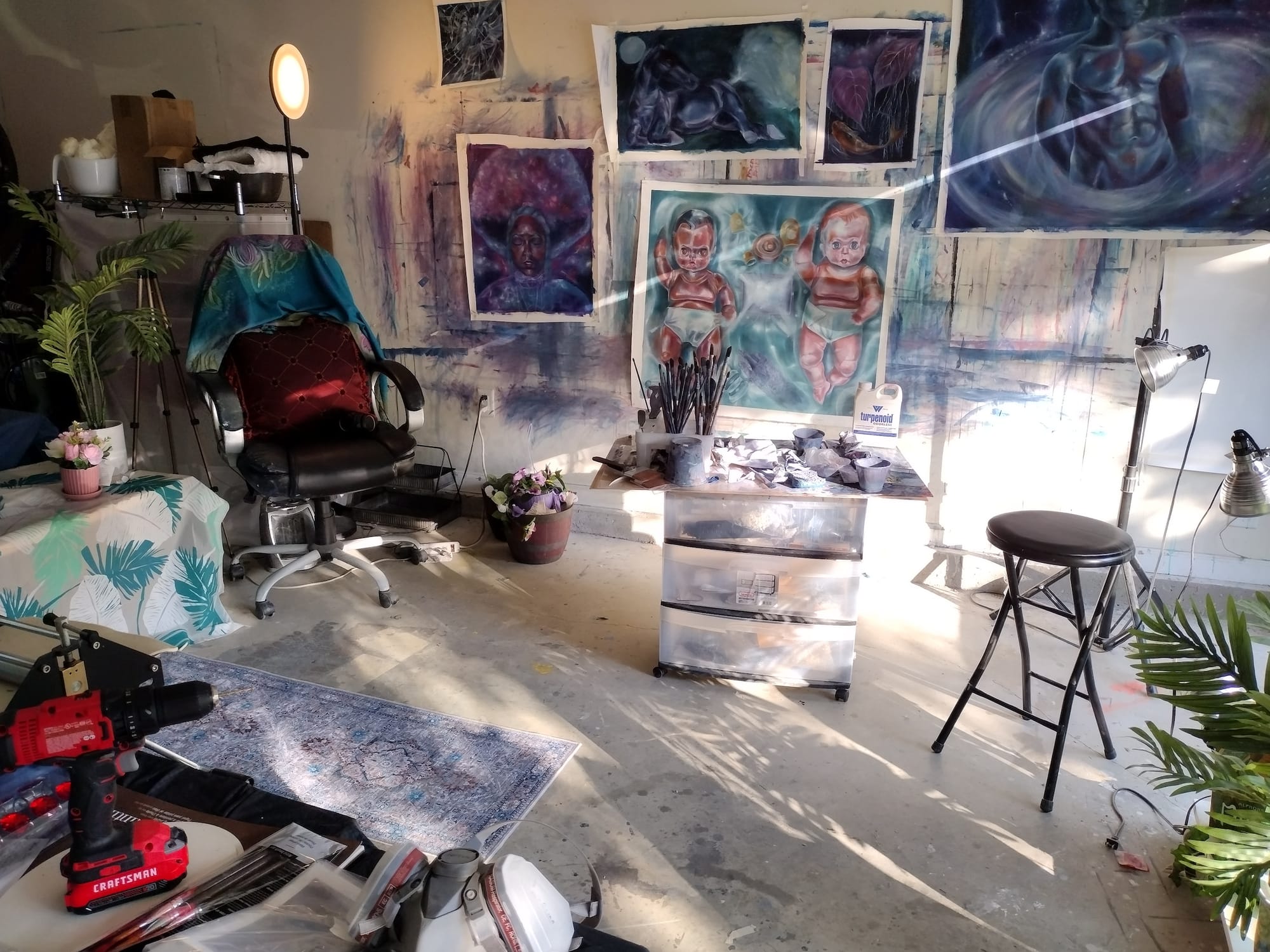 Sometimes I begin right when I wake up — but mostly I’m a night owl and spend late-night hours painting until bedtime. It’s invigorating to tap into multiple concepts at once — all telling one story. One painting ultimately ends up informing the others, and the process is rewarding, especially if I get stuck on a particular painting and resolving it becomes draining. I like to stream a binge-worthy show in the background, or I’ll listen to my favorite conspiracy or art theory YouTube channels. My favorite thing to listen to is my huge curated playlist, filled with genres ranging from pop, hip hop, dancehall, orchestra, alternative, and more. I like to light my incense to fragrance the space, a lavender scent gets me into the creative space ... and I forget that I’m inhaling painting fumes.