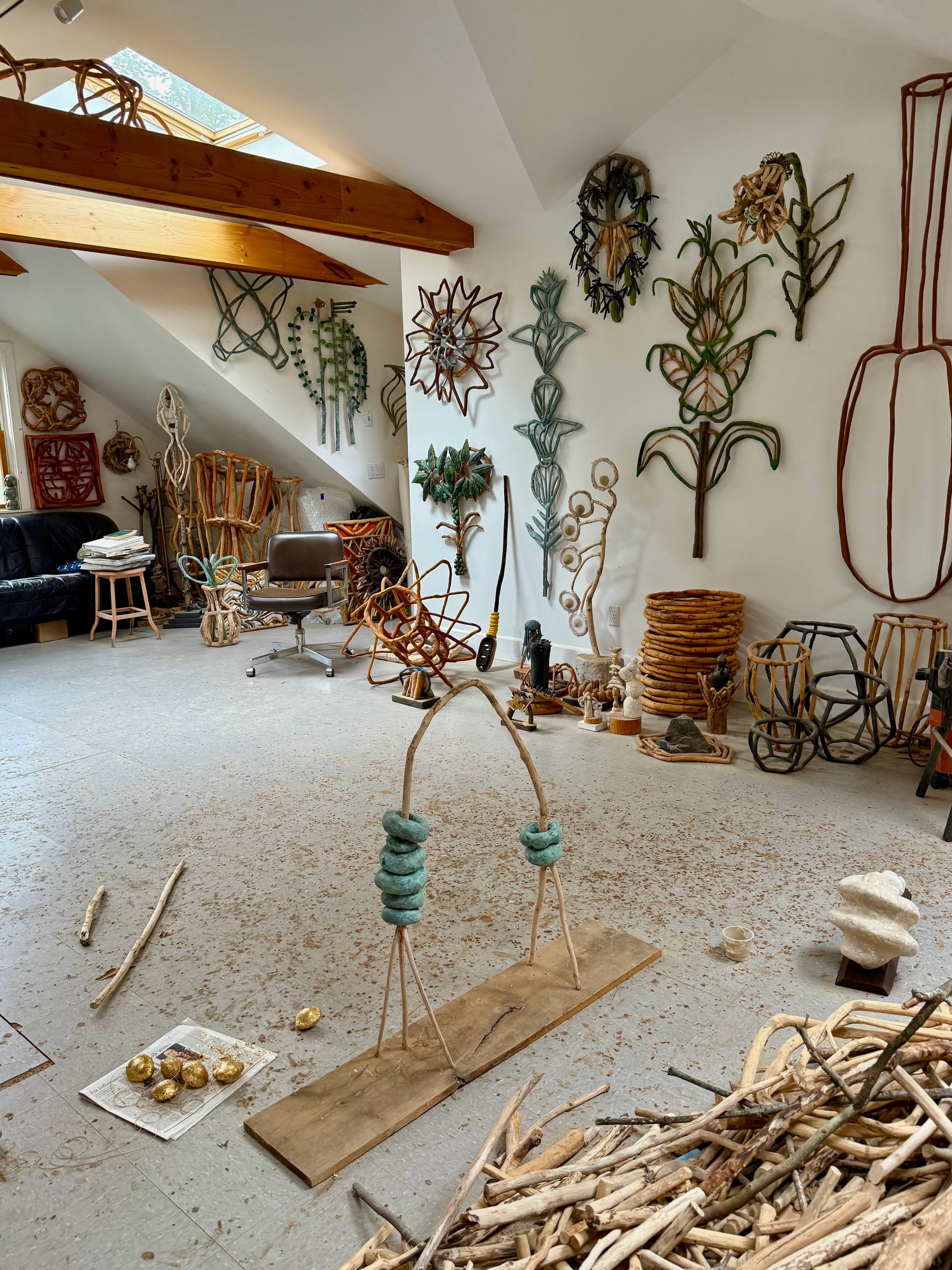 An average day usually begins with a walk surrounding my studio where I collect tree limbs and branches that have fallen to the ground. During these walks, I also figure out how to engineer my sculptures and make all the small parts fit and connect. There's a lot of thinking and "non-studio" time to create my work. I then haul the sticks up to my studio.