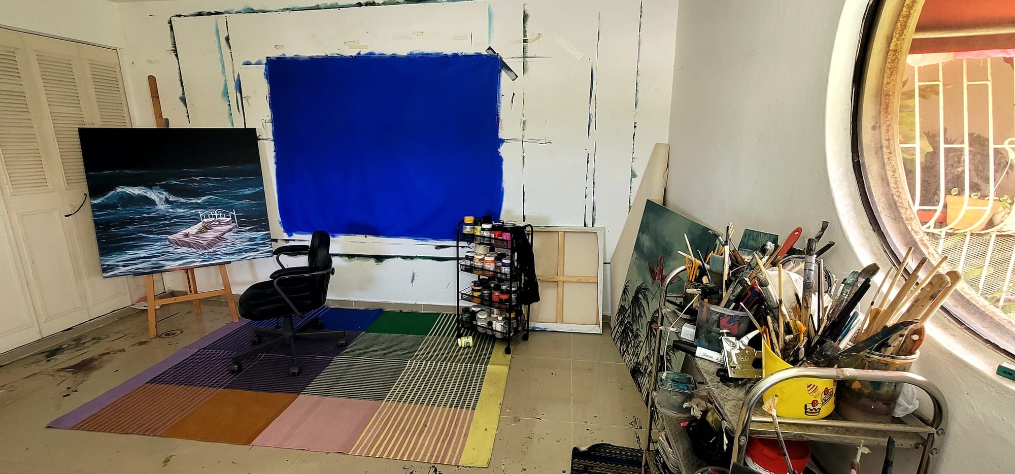 I have a fluctuating work schedule — it usually depends on whether I have a project or a show going on. But in general terms, I start by opening the studio windows around 9am. Most of the time, I'm working on several pieces at once; I'd like to think it keeps me from getting bored or overwhelmed. My daily ritual begins with a cup of coffee and some playtime with my cat, Iro. During work hours, I’m usually listening to music — it deeply influences the work I'm doing at the moment. I also tend to call my friends and gossip for hours while I paint. Sometimes I think that makes my work a collective piece, in a funny way.