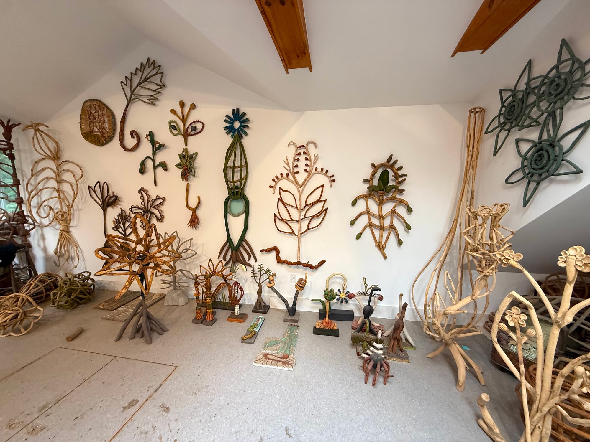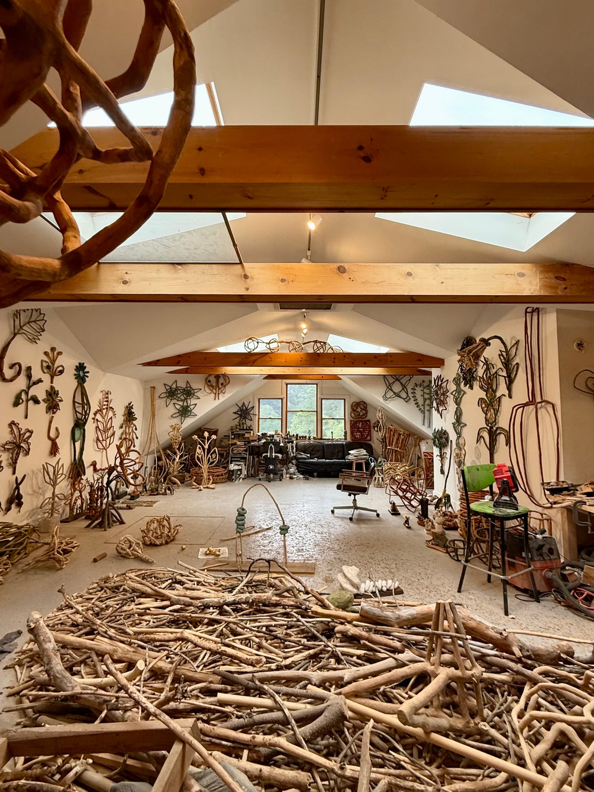 An average day usually begins with a walk surrounding my studio where I collect tree limbs and branches that have fallen to the ground. During these walks, I also figure out how to engineer my sculptures and make all the small parts fit and connect. There's a lot of thinking and "non-studio" time to create my work. I then haul the sticks up to my studio.