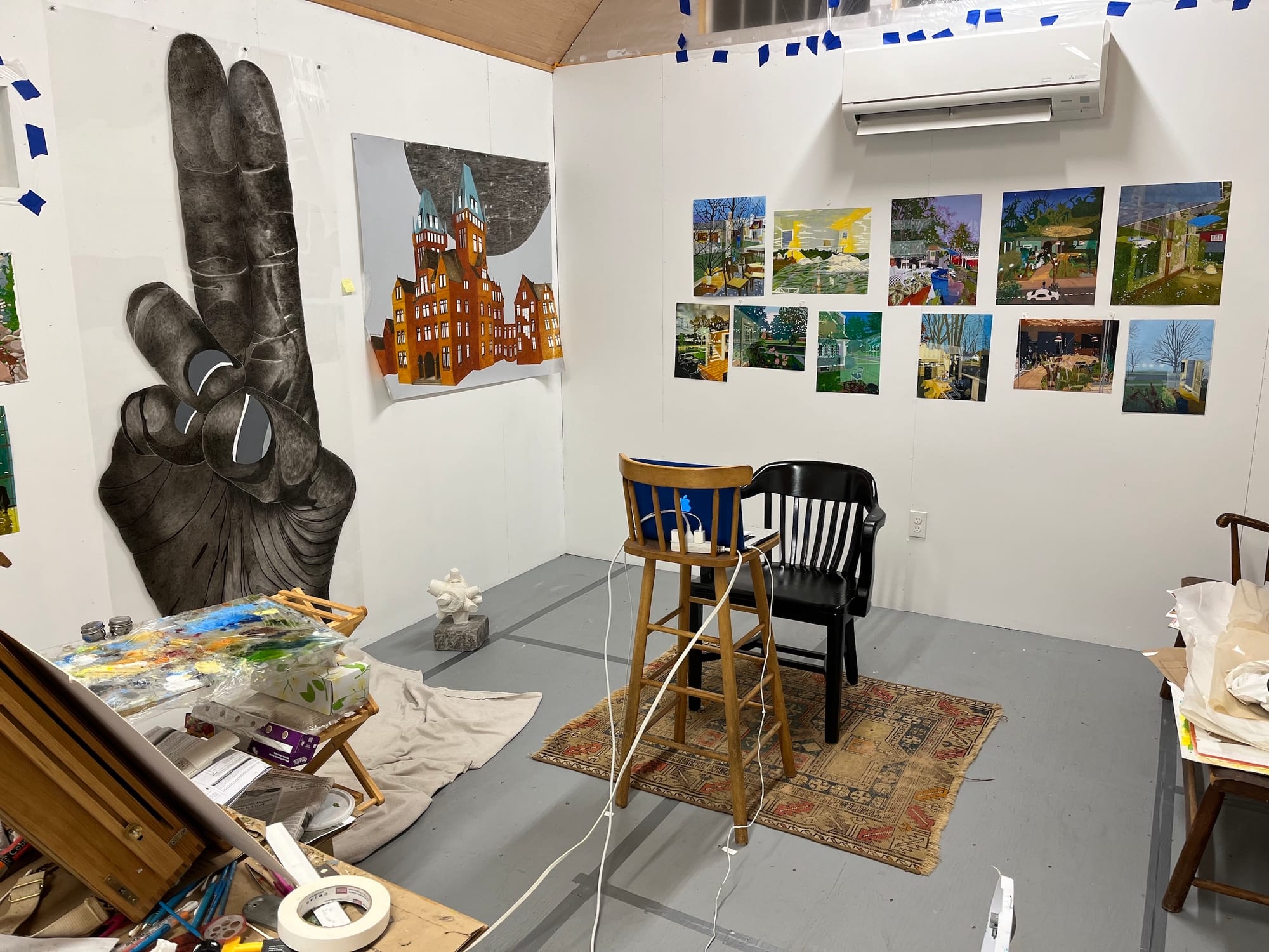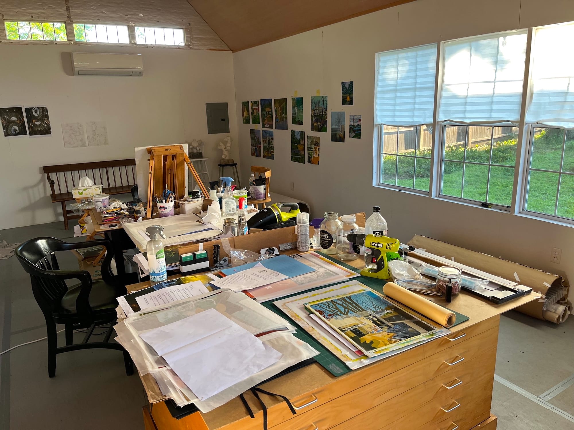 My studio is ample and filled with natural light. It has high ceilings, and the windows look out on trees and the surrounding neighborhood. It is highly accessible, and this ease of access helps make me highly productive. At times, ideas for paintings are found close at hand, in and around the built environment of my home and neighborhood.