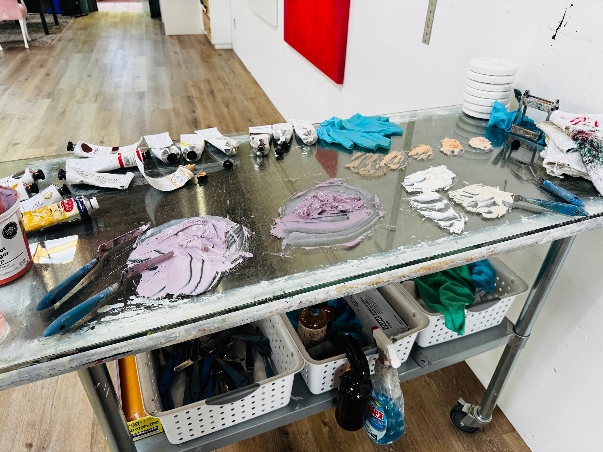 I typically either work out at the gym, or hike, before I get here around 9:30am. I tend to putter around, answer emails, and just generally organize things for an hour or so. I always put music on, which directly ties to my mood and energy for the day. I decide what I’m going to paint and start mixing colors … and then I work. I work on one piece at a time — start to finish. There are days when I work on prepping several canvases, or on varnishing several works, but as far as creation, the energy of a piece only feels pure if I work exclusively on one at a time.