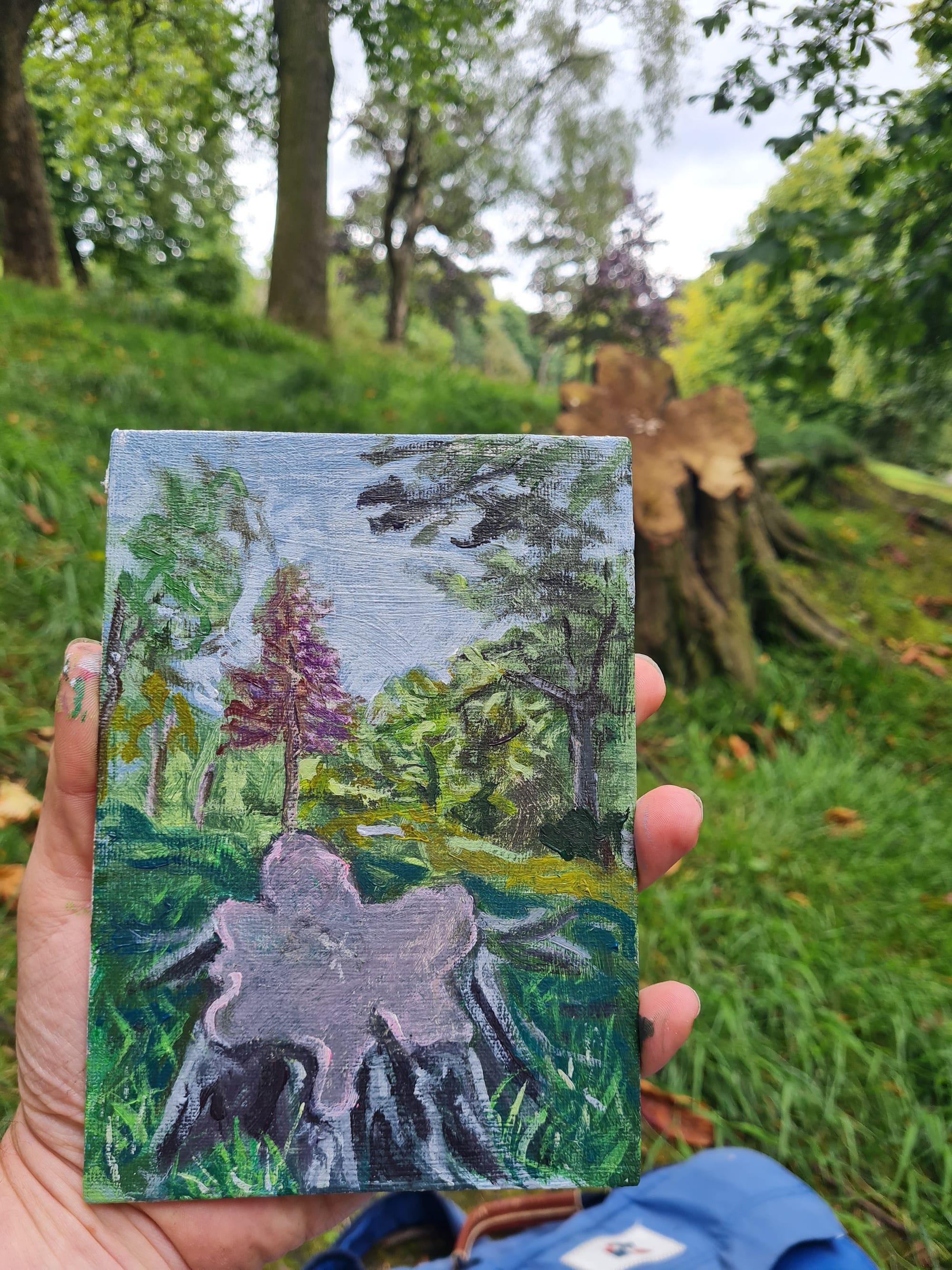 For most of my career, I have worked from photographs. One day, my phone died while I was sitting underneath a tree in Hyde Park. For that moment I felt more attentive and present. I began to make a detailed drawing of the tree I was sitting under, and ever since then I have been making paintings outdoors. I will often try to find green spaces, as I find the unpredictability in nature exciting. I sometimes listen to music while working, but I try to not let this distract me from the painting process.