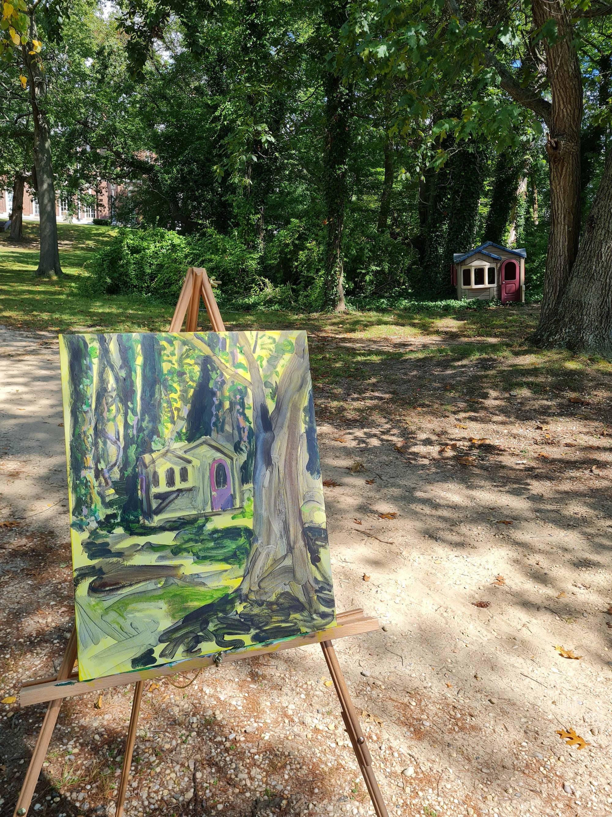 A negative aspect of painting outdoors is when dogs become engaged with the painting. I love dogs, but they often approach trying to sniff or taste the acrylic paint. I have to be extra careful that they don't get harmed trying to taste paint.
