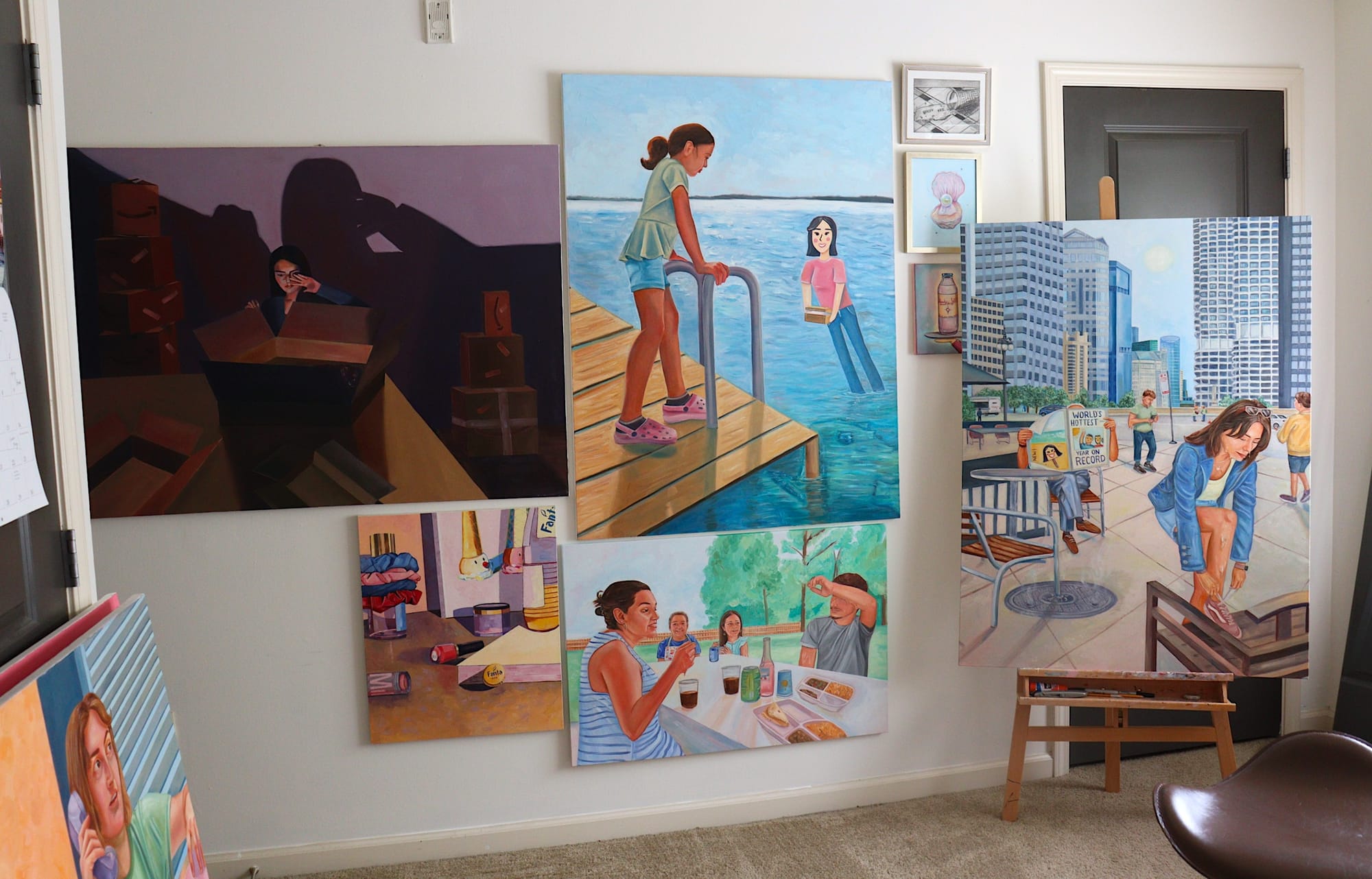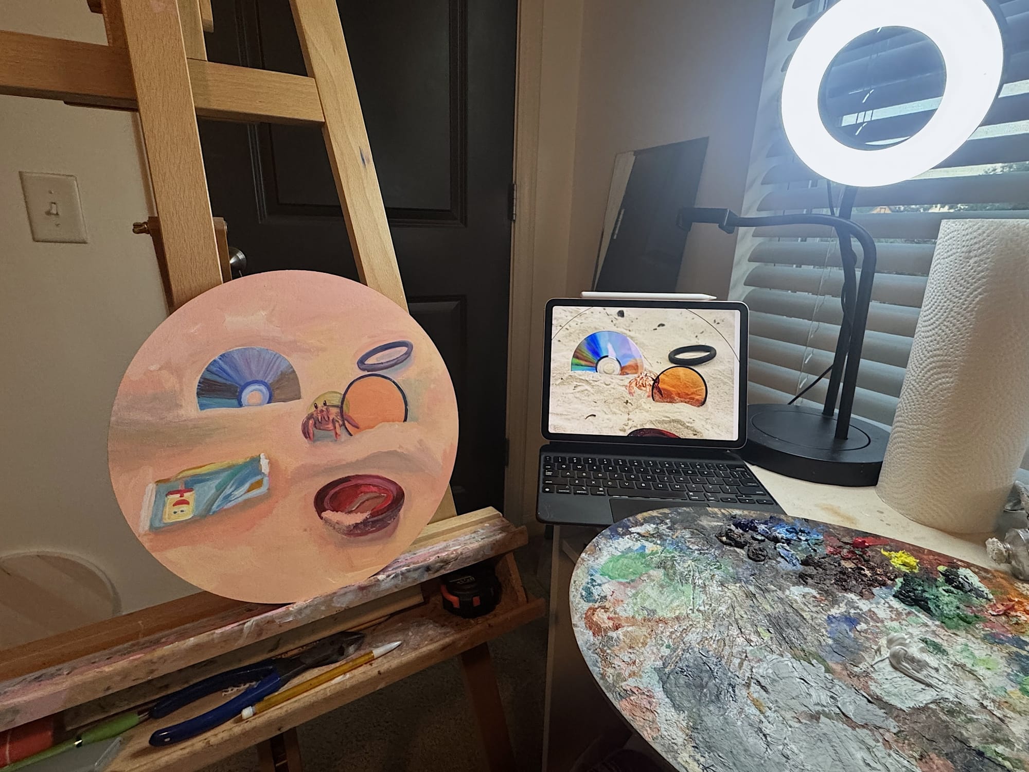 From the third floor of my apartment, my studio is nestled in a corner of my room. As a night owl, I find myself most inspired to paint around 7pm, just after dinner when I’m ready to dive in. After a full day at my 9-to-5 job, I slip into what I call my "second job." Setting up my palette, I cue up the latest reggaetón hits, pop in my AirPods, and settle into that creative flow state — with iced sweet tea or a cup of chamomile tea on standby.