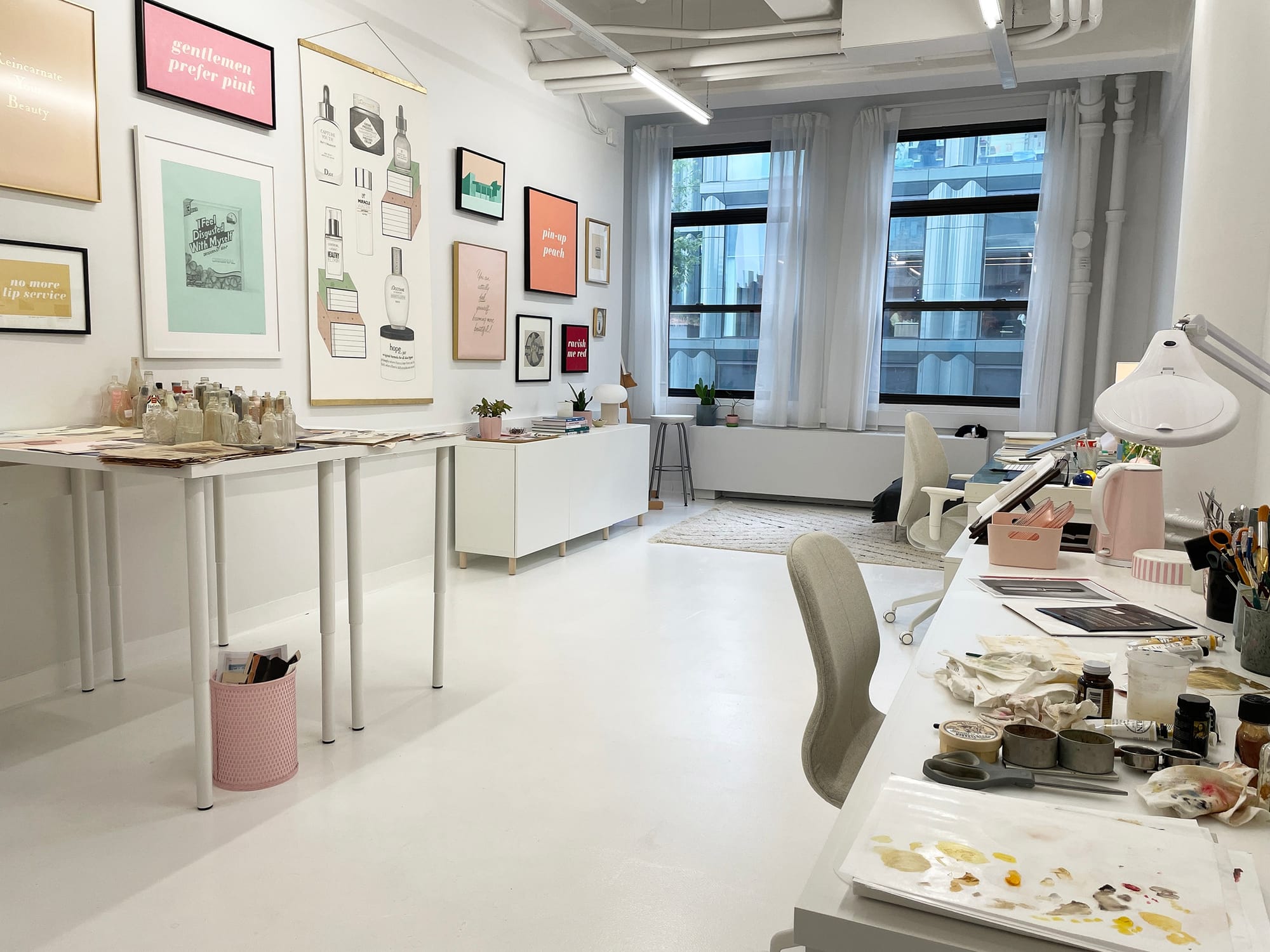 Leaving my beloved studio in Gowanus, Brooklyn, was difficult, but I longed for windows and natural light. I found this Hudson Square space and painted the floors white — now it glows like a jewel box. I call it “Candyland” because it’s where I play and feel most myself, surrounded by my art and a pastel palette that runs through much of my work. It’s larger than my past studios, with dedicated spaces for painting, collaging, and thinking.