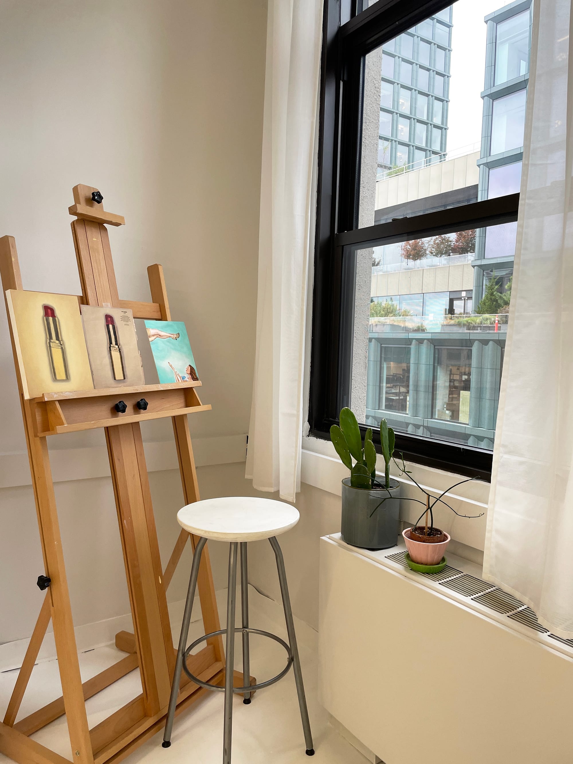 Though I miss the community of my old studio building, I’ve grown to love the independence of this space. My building is filled with musicians, engineers, and nonprofits rather than artists, but that separation gives me focus. I still stay close with my Brooklyn art circle and enjoy visiting friends’ openings around Tribeca, Chelsea, and the Lower East Side — a quick bike ride away.