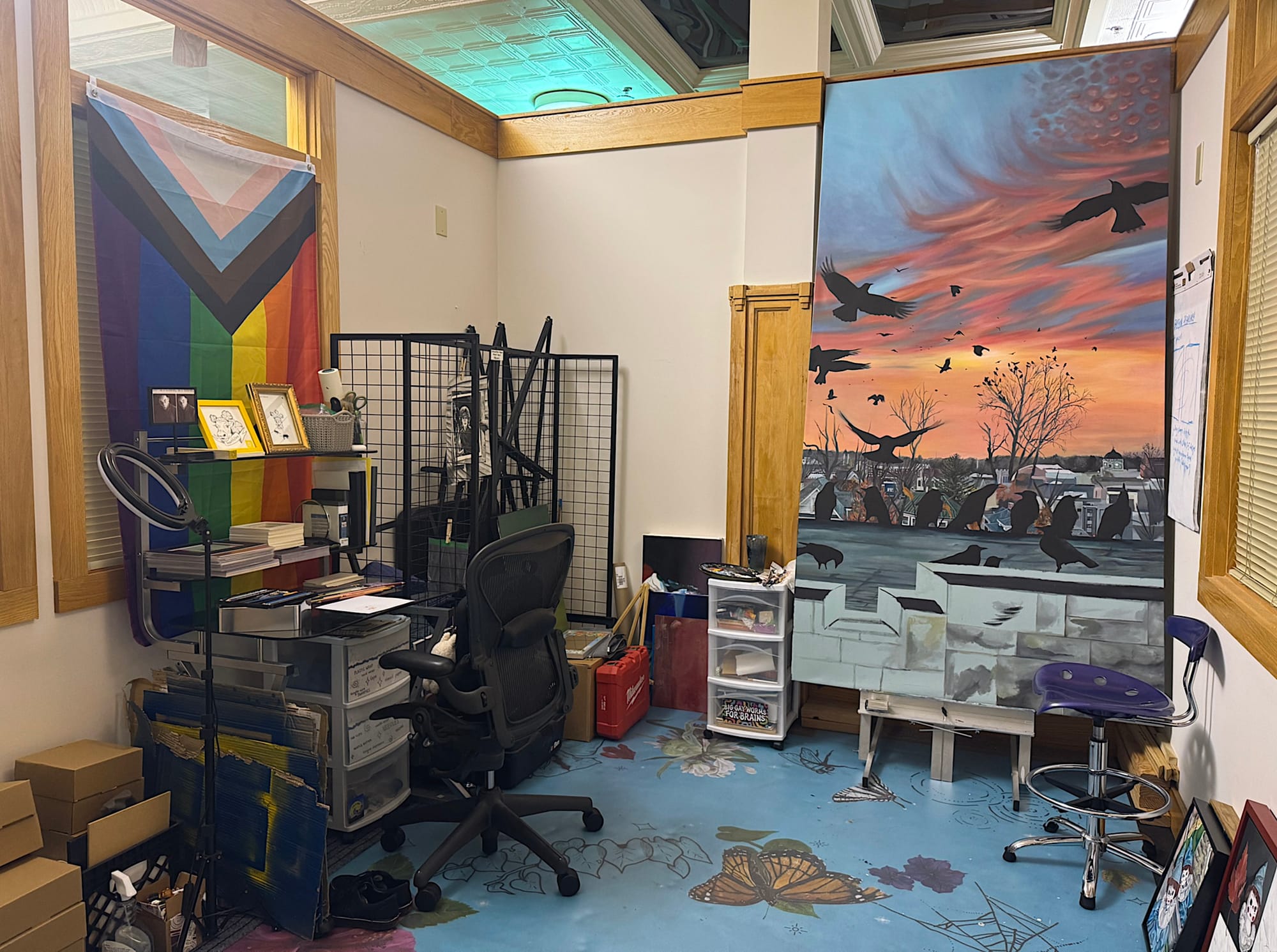 I do most of my administrative studio work from home (applications, web editing, etc.) and save my studio space for artmaking. For many years I worked exclusively from my living room — I often still do for smaller projects — but my studio offers fewer distractions and less cat hair. It’s pretty private up in my studio, but I love knowing I’m in the center of town and can step outside anytime to walk around the Bloomington Square or down the B-Line.