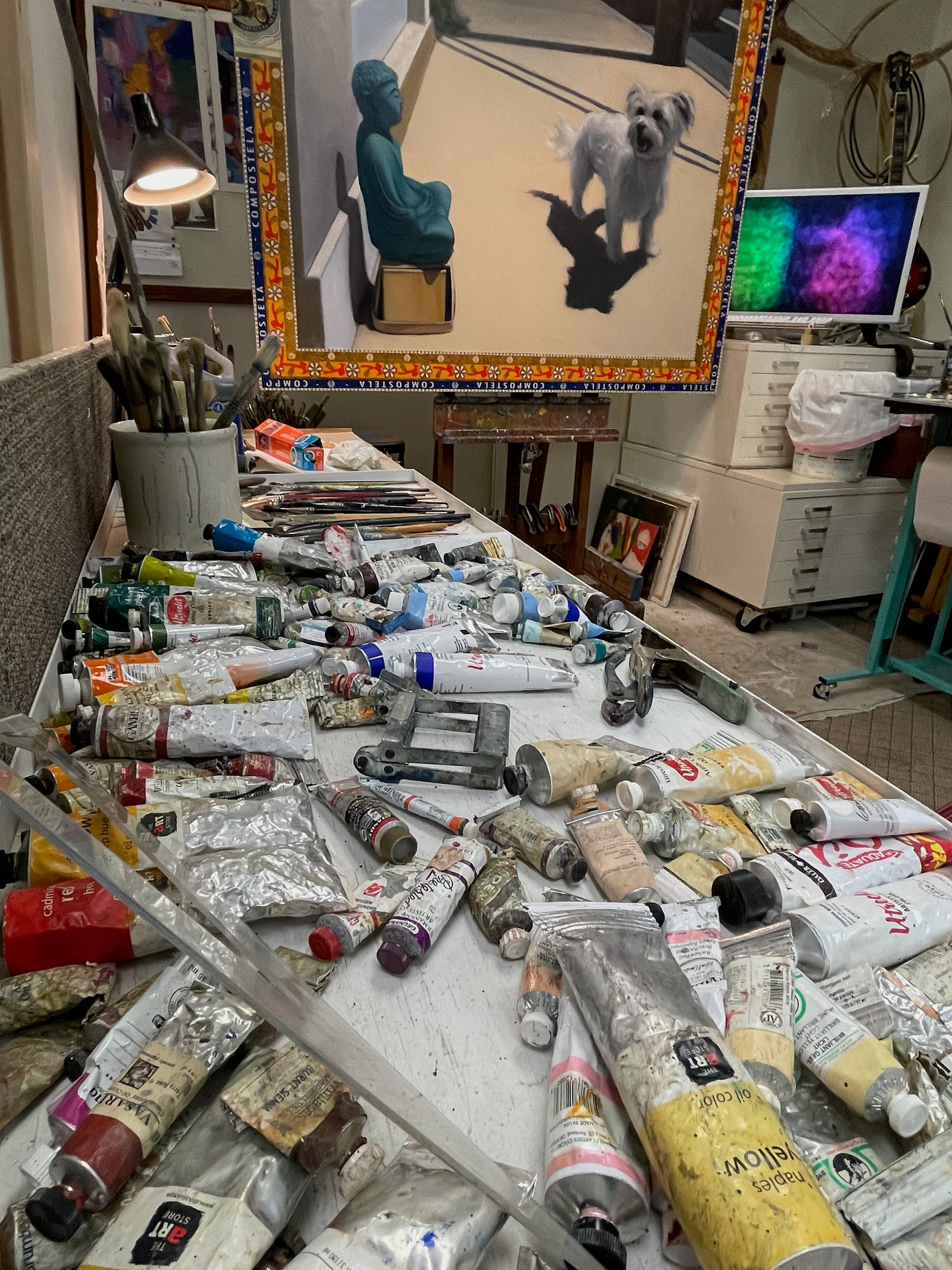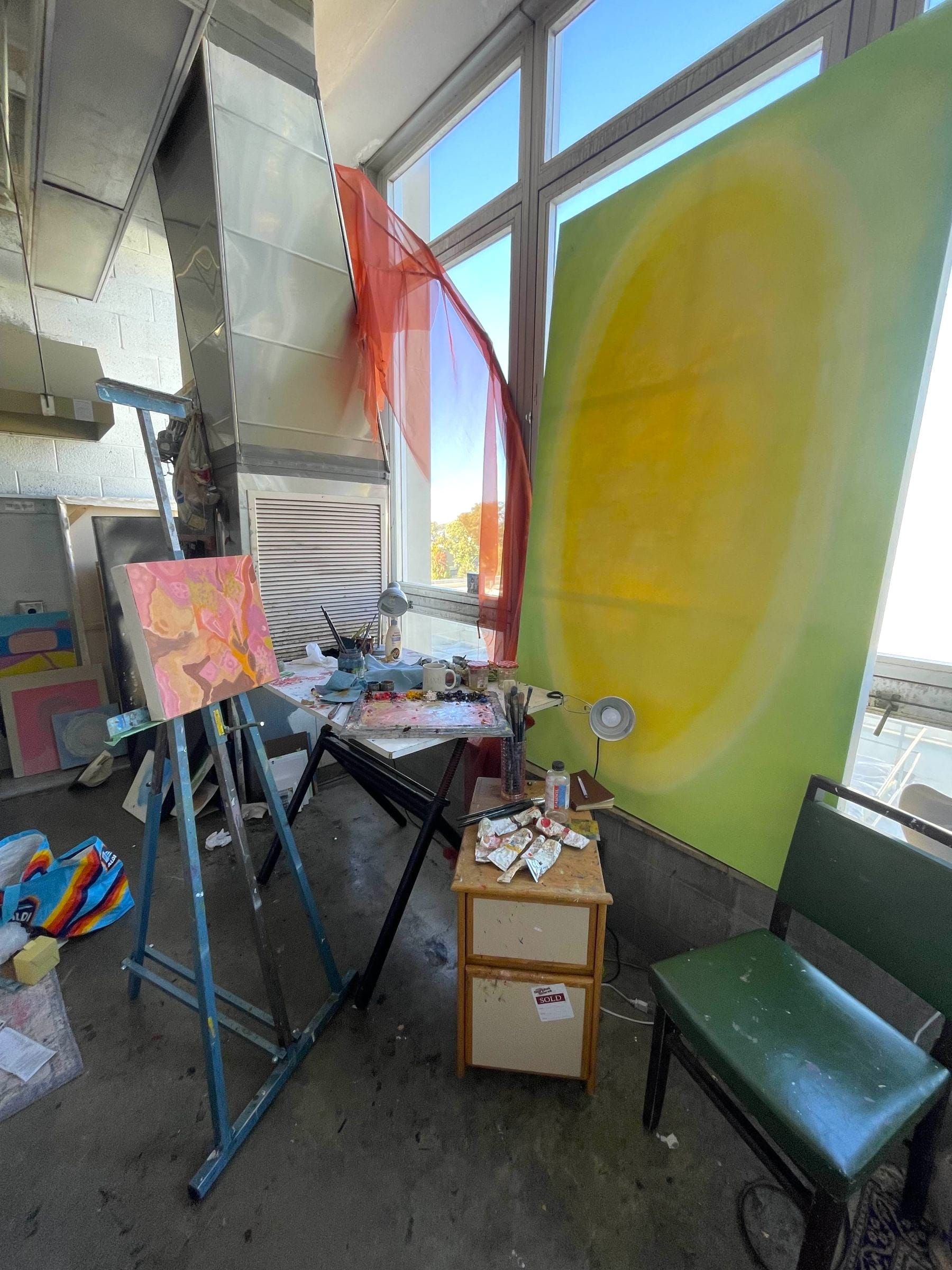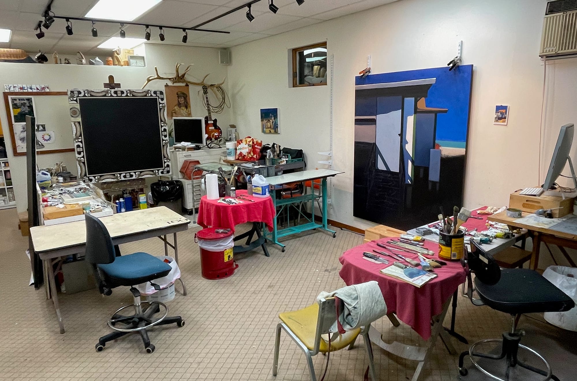 It's a gift to be where I am. I'm very lucky to be there and I'm very grateful. Tall ceilings, a bathroom, sink, separate office area, and the studio. I couldn't have found a nicer spot. As the photos show, I can work on large paintings. I couldn't do that years ago when I was working out of my basement.