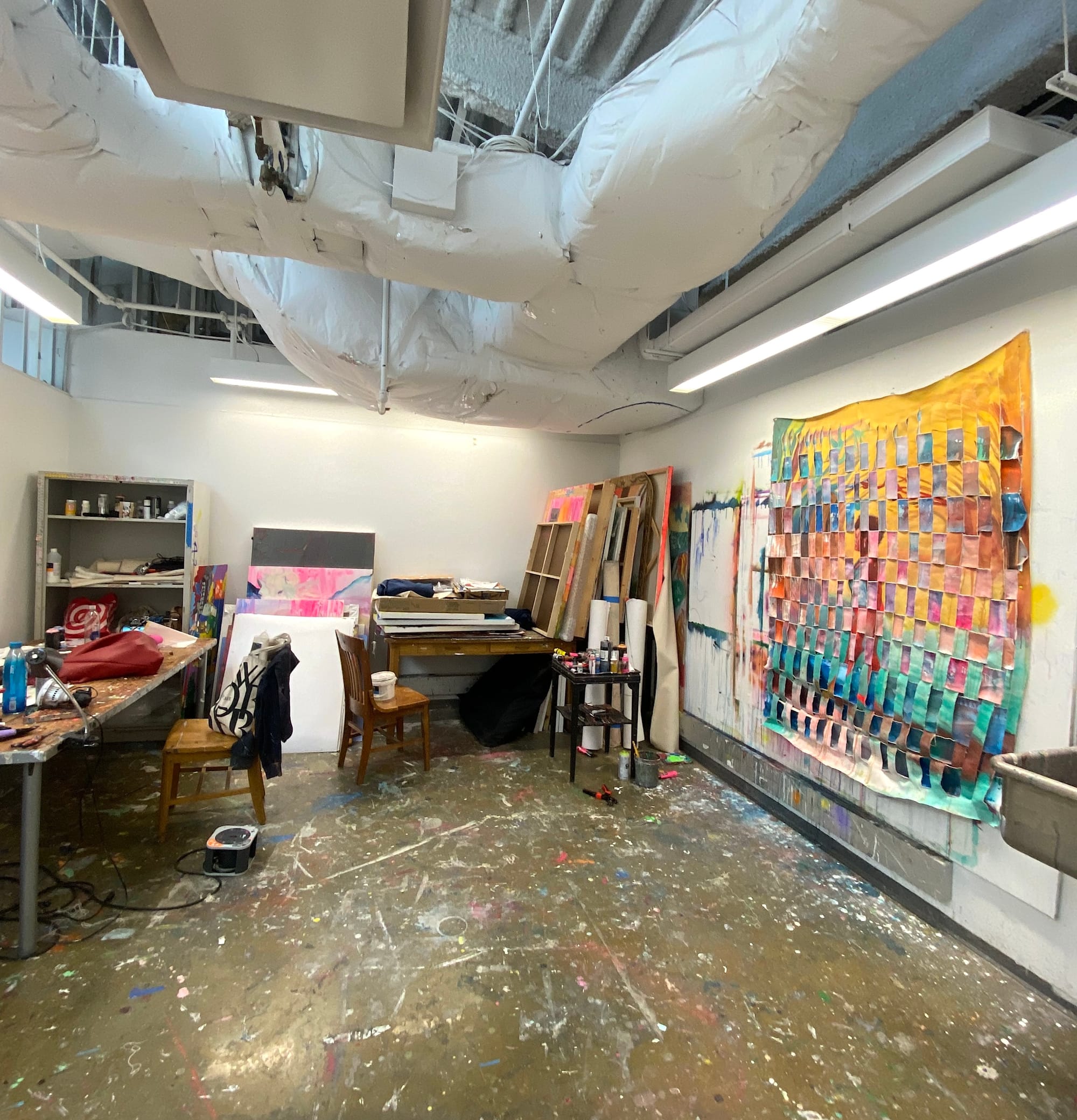 Welcome to the 314th installment of A View From the Easel, a series in which artists reflect on their workspace. This week, artists pace about their studios and weave painted canvases.