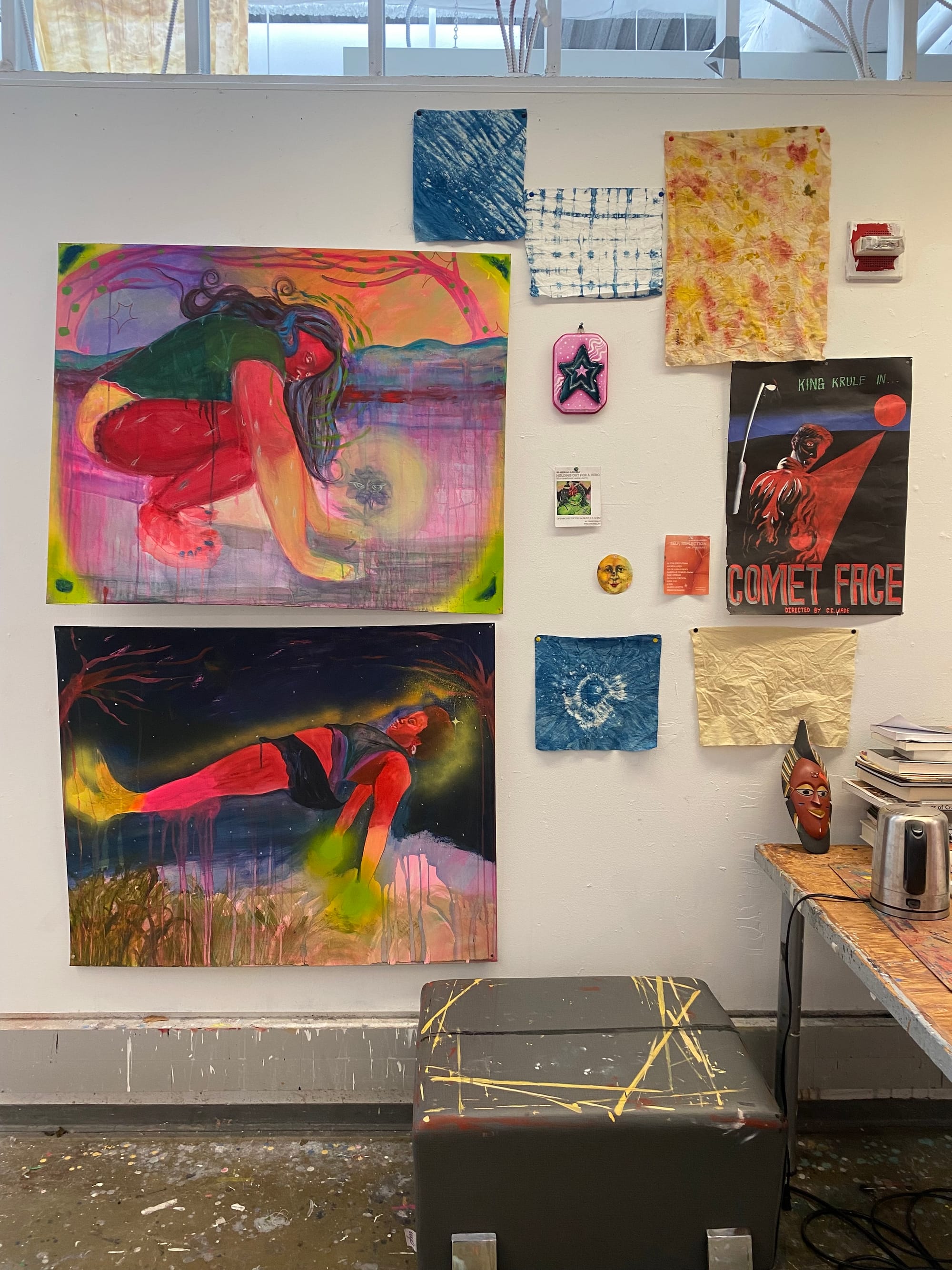 Oil paint, pencil, stoneware clay, gouache, watercolor, and silkscreen print.