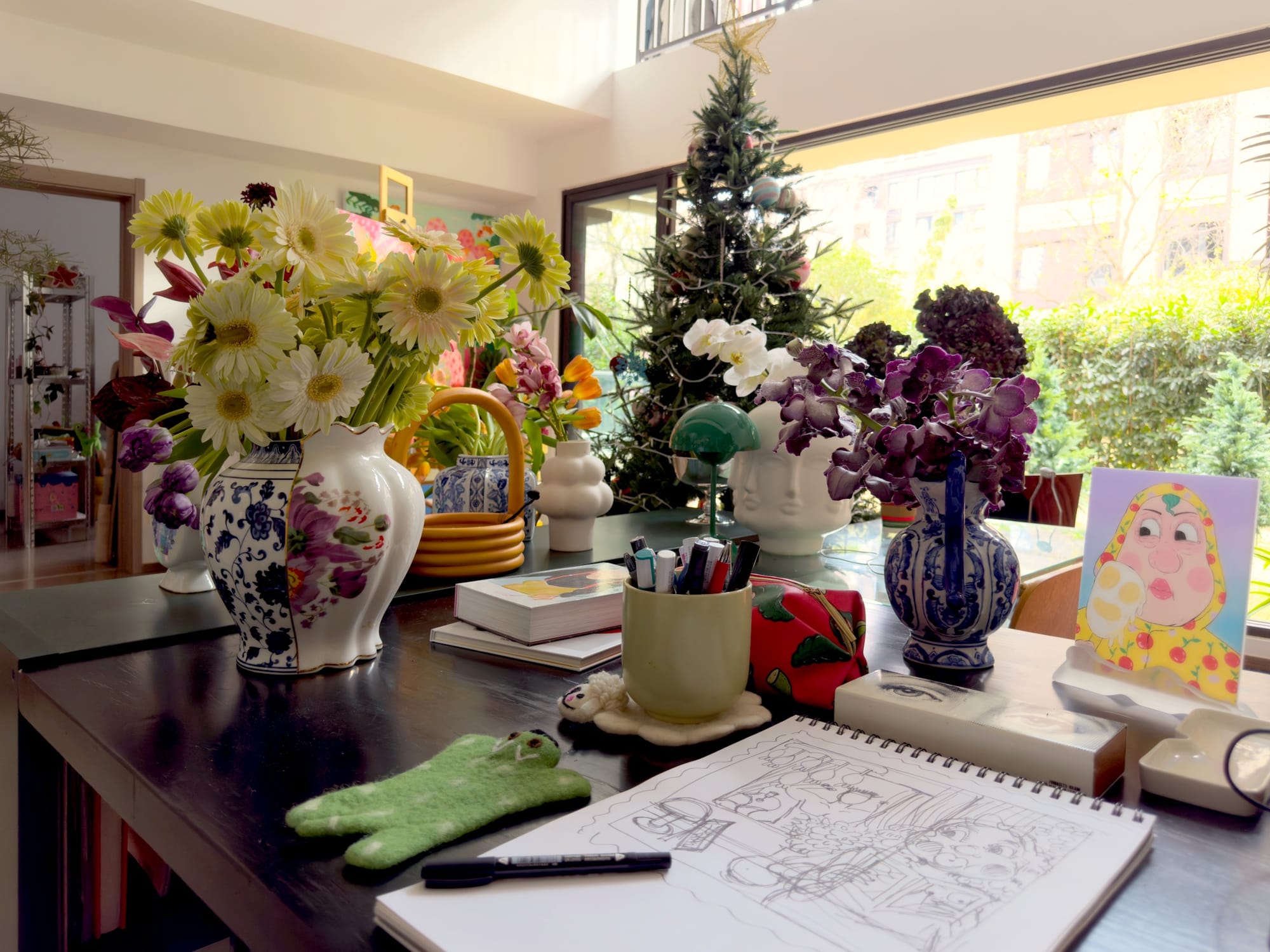 I usually start around 10am, and I'm always with an iced Americano when I'm in my studio. My studio has massive floor-to-ceiling windows facing a courtyard, so I really enjoy that prime natural light between 10am and 2pm, which is when the colors feel most honest. I paint in the main hall, occasionally watching birds outside. Being a Virgo, I always finish one piece before starting the next. My soundtrack is usually dreamy; Spotify says my top track this year was Bel Canto’s "Unicorn."