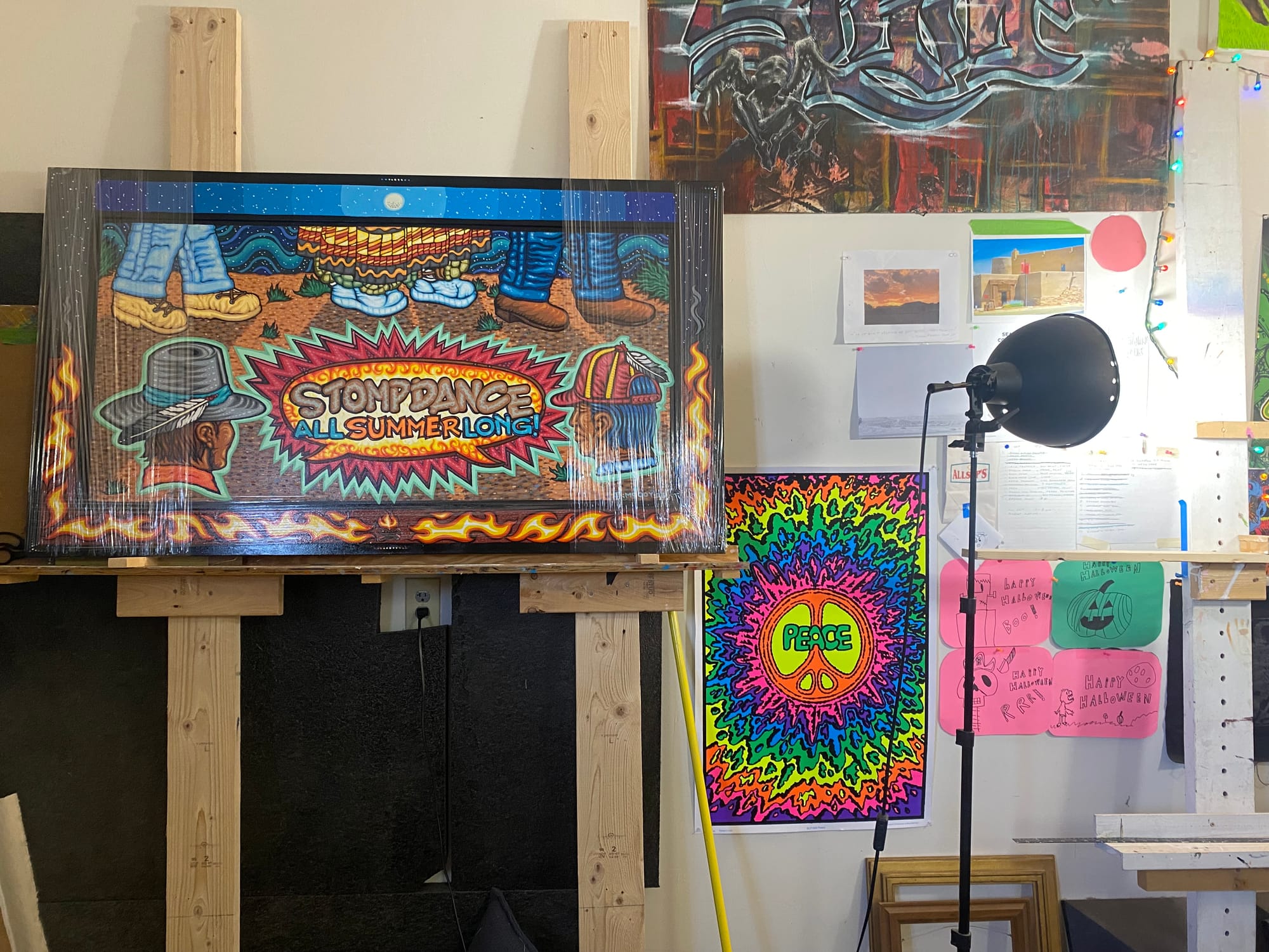 I wake around 5:15am. I wake up my family and animals. We leave the house around 7, and I drive 35 miles south up to Santa Fe. I return around 9:15am from dropping my Wife Topaz, who is a teacher, son Levon, and daughter Fia at three separate schools. I begin painting around 10am. Music and coffee play an important role at this time. I work until 2:30pm then repeat the process. We will usually do something for dinner, and then I will work until late into the evening. Especially if there is a time-sensitive project that I am working on.