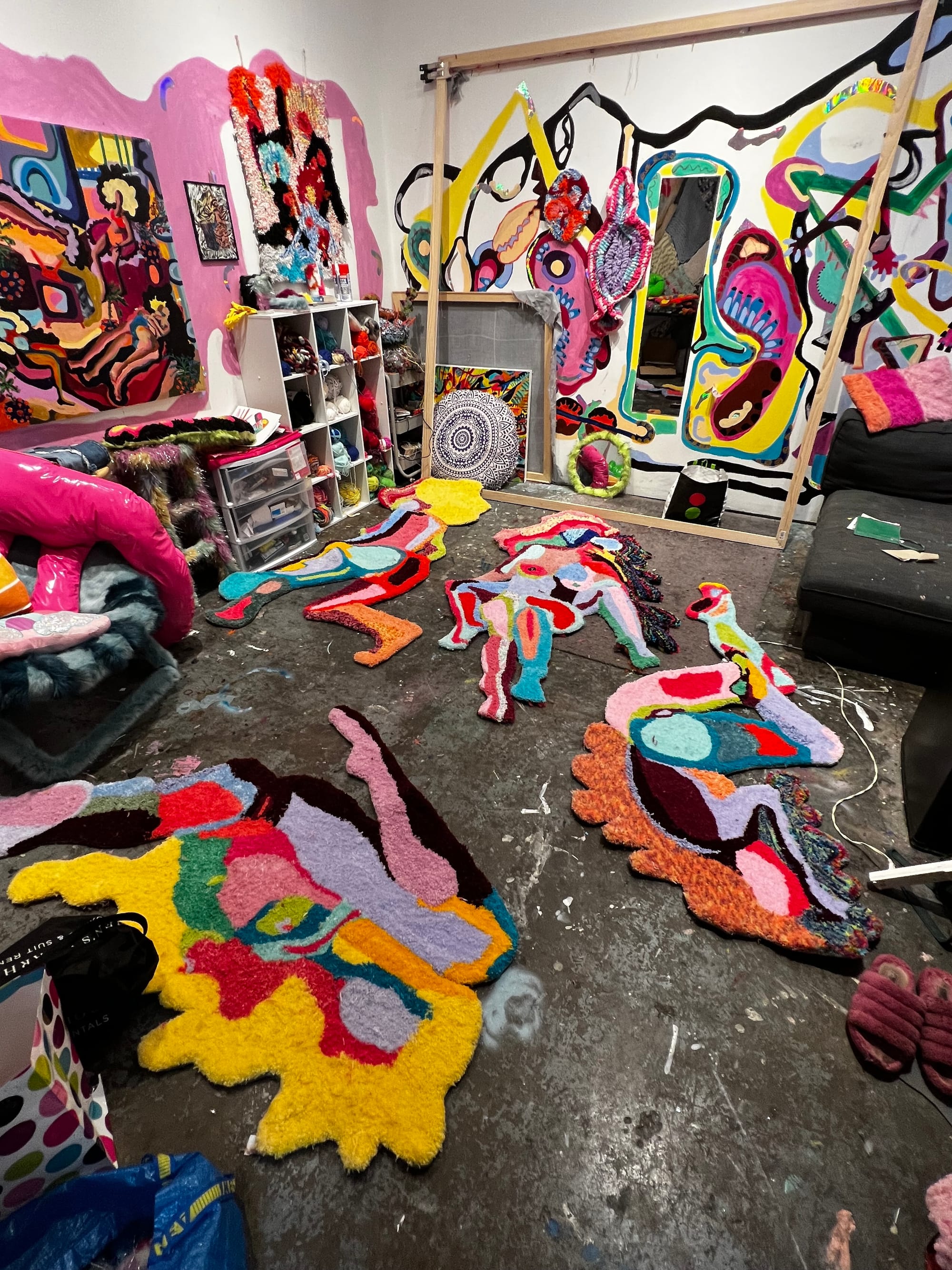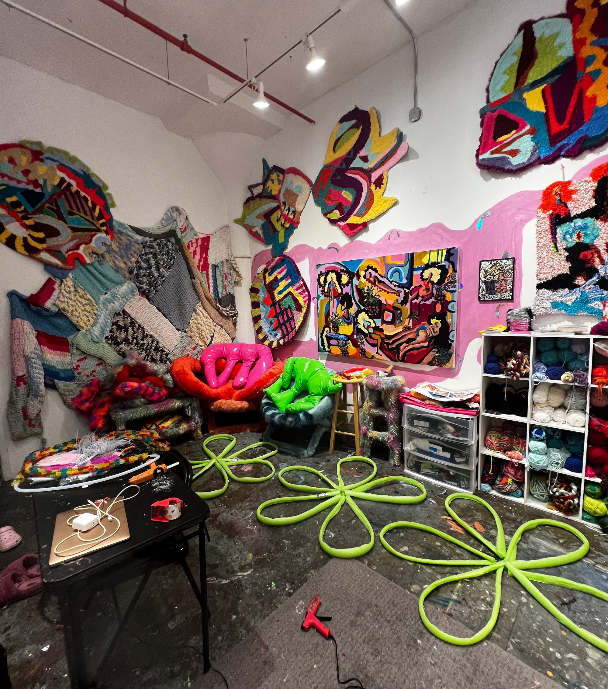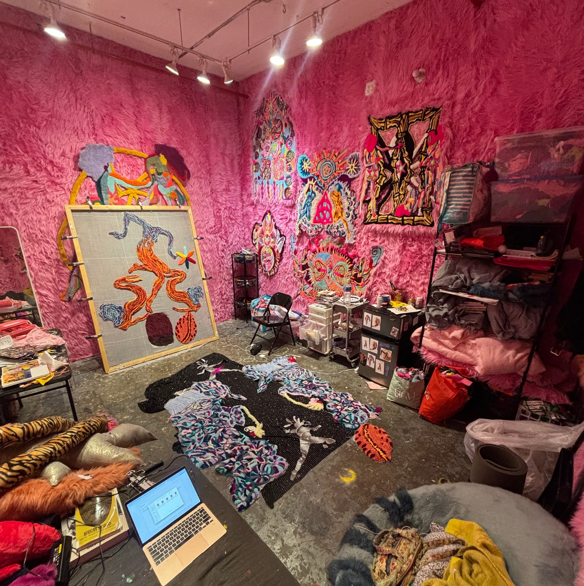 My space is a direct reflection of my work and vice versa. I create Safe Space immersive installations for people to heal in and imagine their own version of utopia. This is the same for my studio, the original Safe Space. I am constantly being coddled by my studio, as it is lined with pink faux fur. My space allows for my work to flourish and for it to guide the progression of my pieces, to aid in the harmony between myself, the piece, and the space.