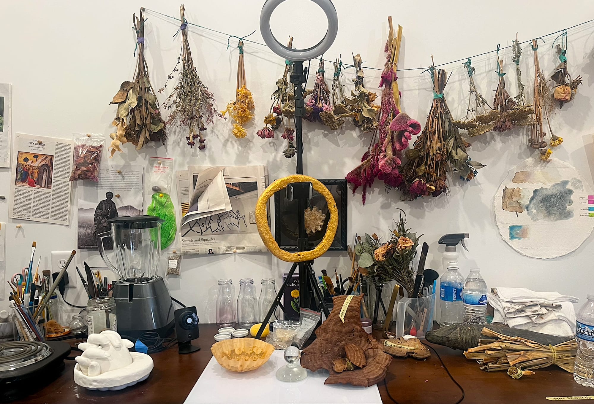 Welcome to the 321st installment of A View From the Easel, a series in which artists reflect on their workspace. This week, artists carve faces into tree trunks and forage for color in the natural world.