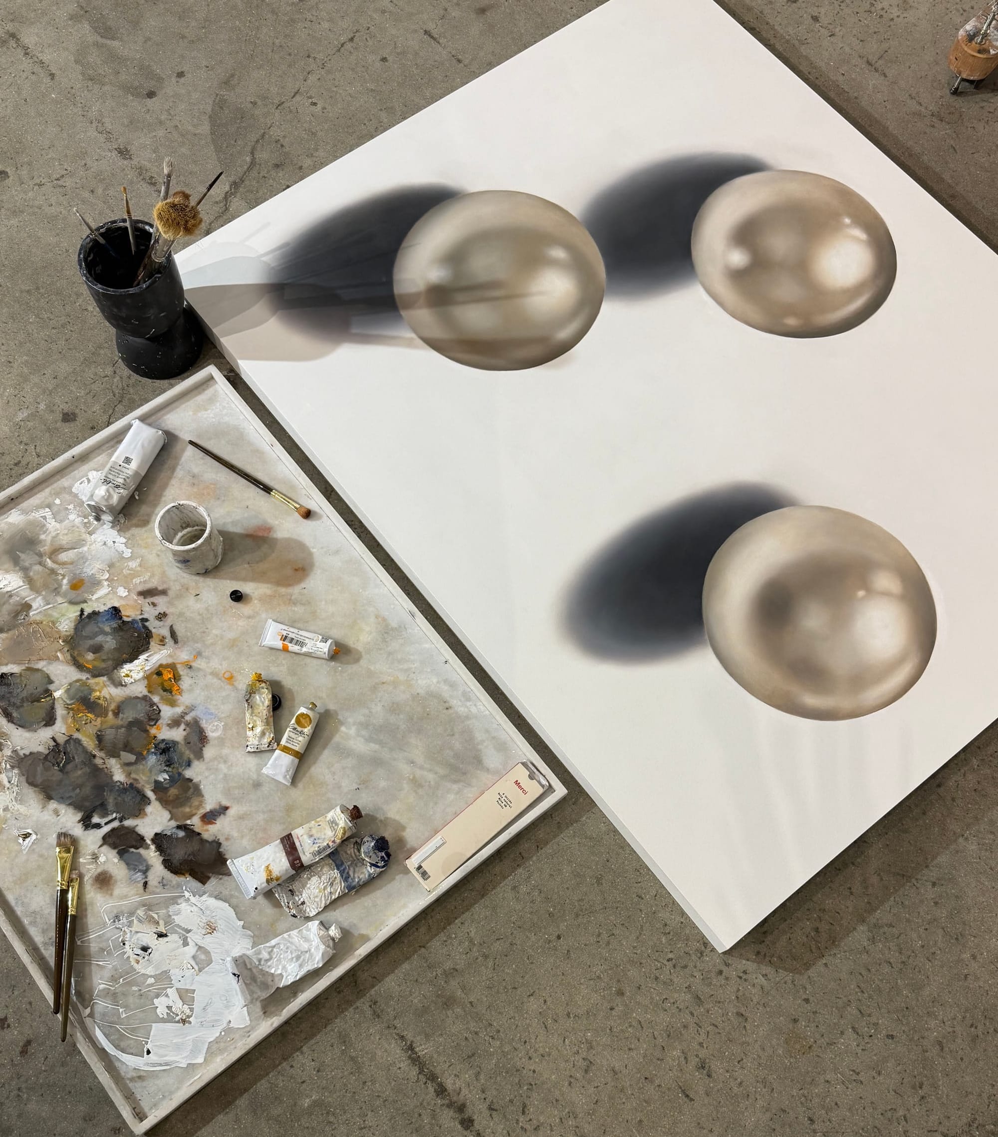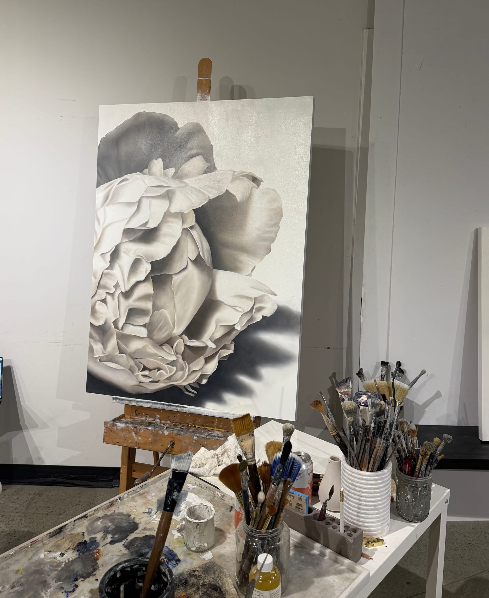 I usually arrive early, after a run or yoga, around 9 am and work for about five to six hours, depending on the day. I focus on only one painting at a time. While I multitask in many areas of life, the studio is different. Here, I slow down and work deliberately. I listen to music while I paint, letting it set the tone. I also love painting at night, when the world is quiet, and will come in from time to time to do so. Otherwise, my evenings are spent sketching or creating at home.