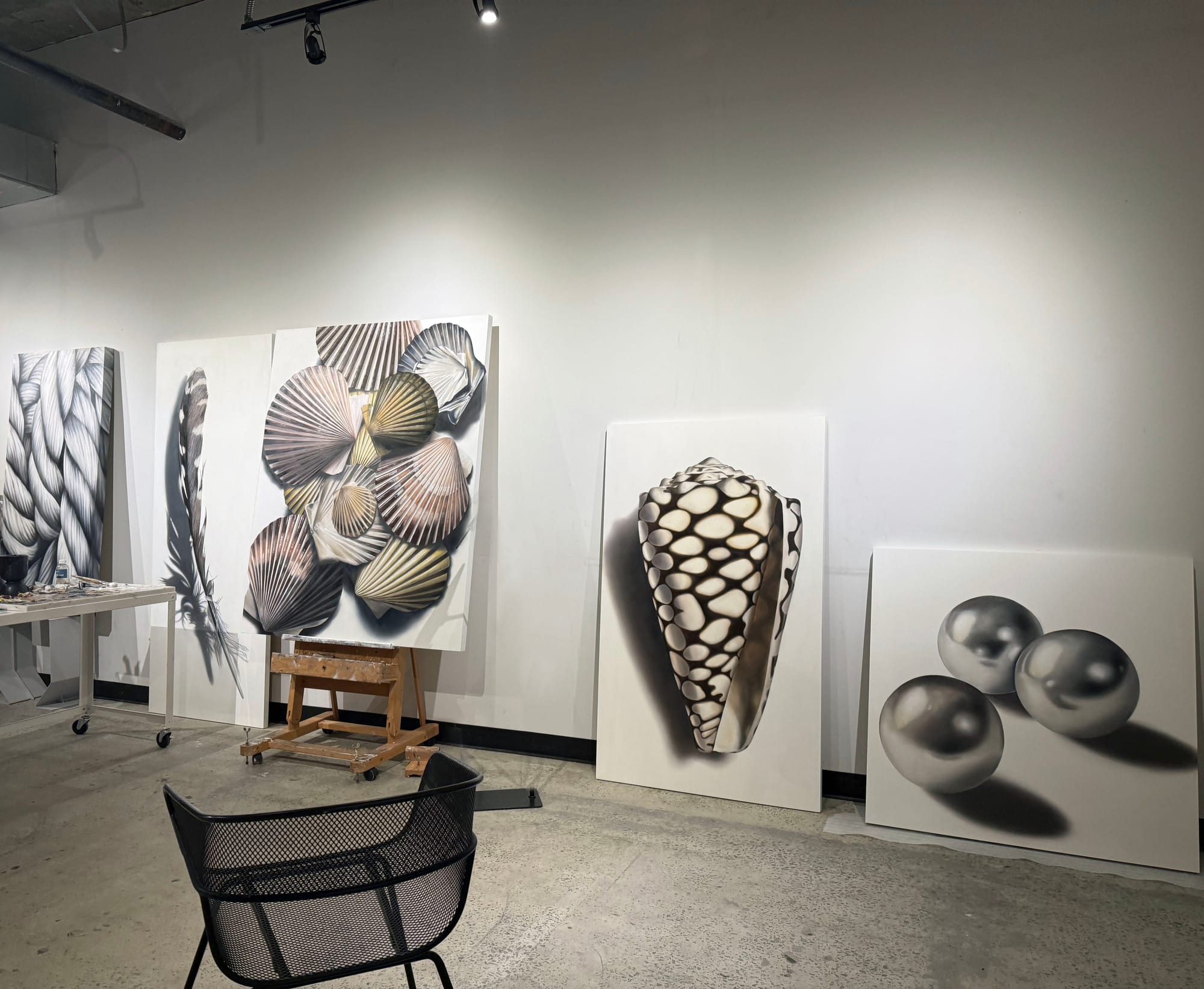 I solely work in oil on wood panel. The richness of oil is unparalleled, as is the way it blends. The slower drying time of oil allows for a more thoughtful, deliberate process. I can refine and adjust over hours or even days, which aligns with the intentional way I like to work. Painting on panel allows for a sleeker finish with cleaner lines and precision. Both materials support my painting style.