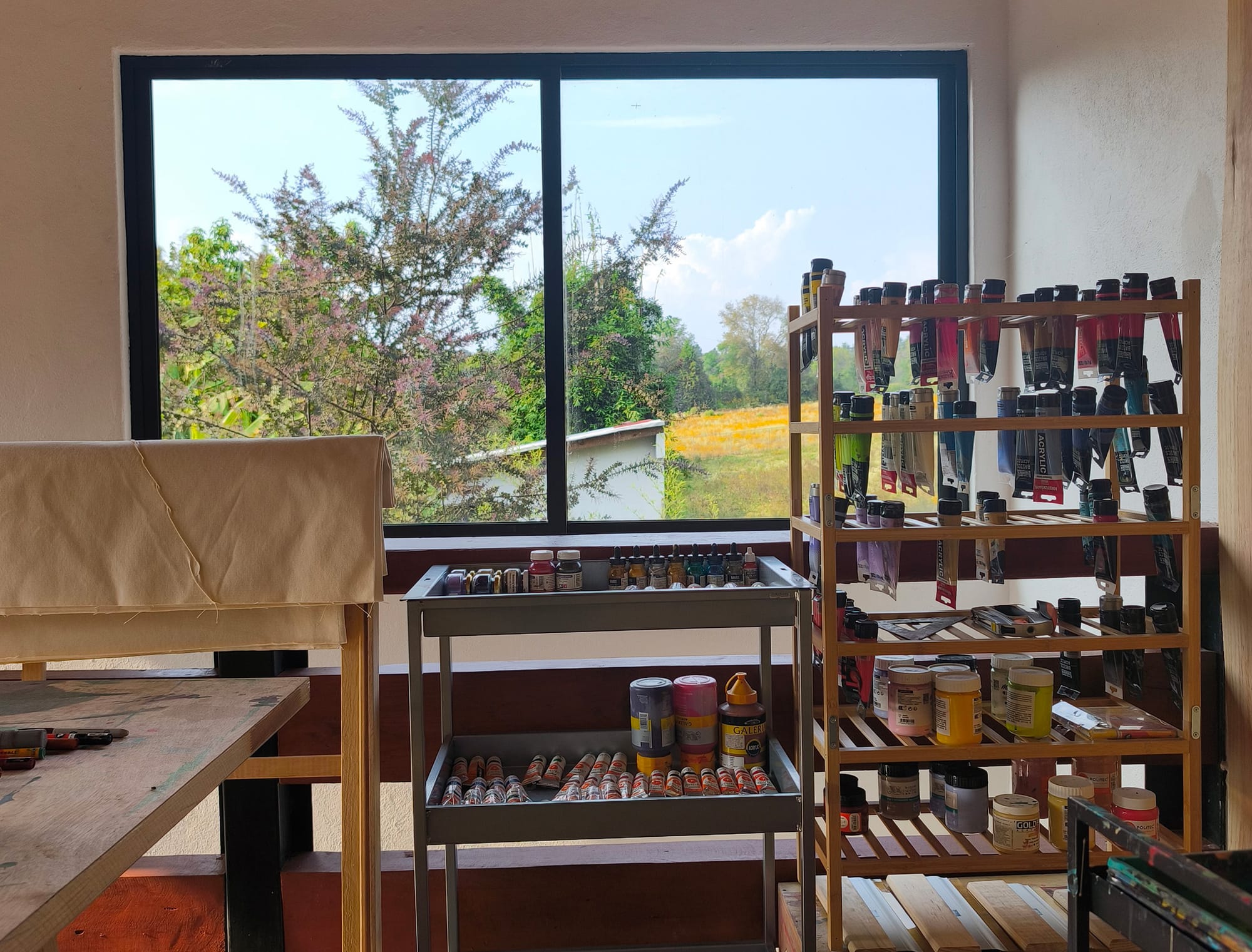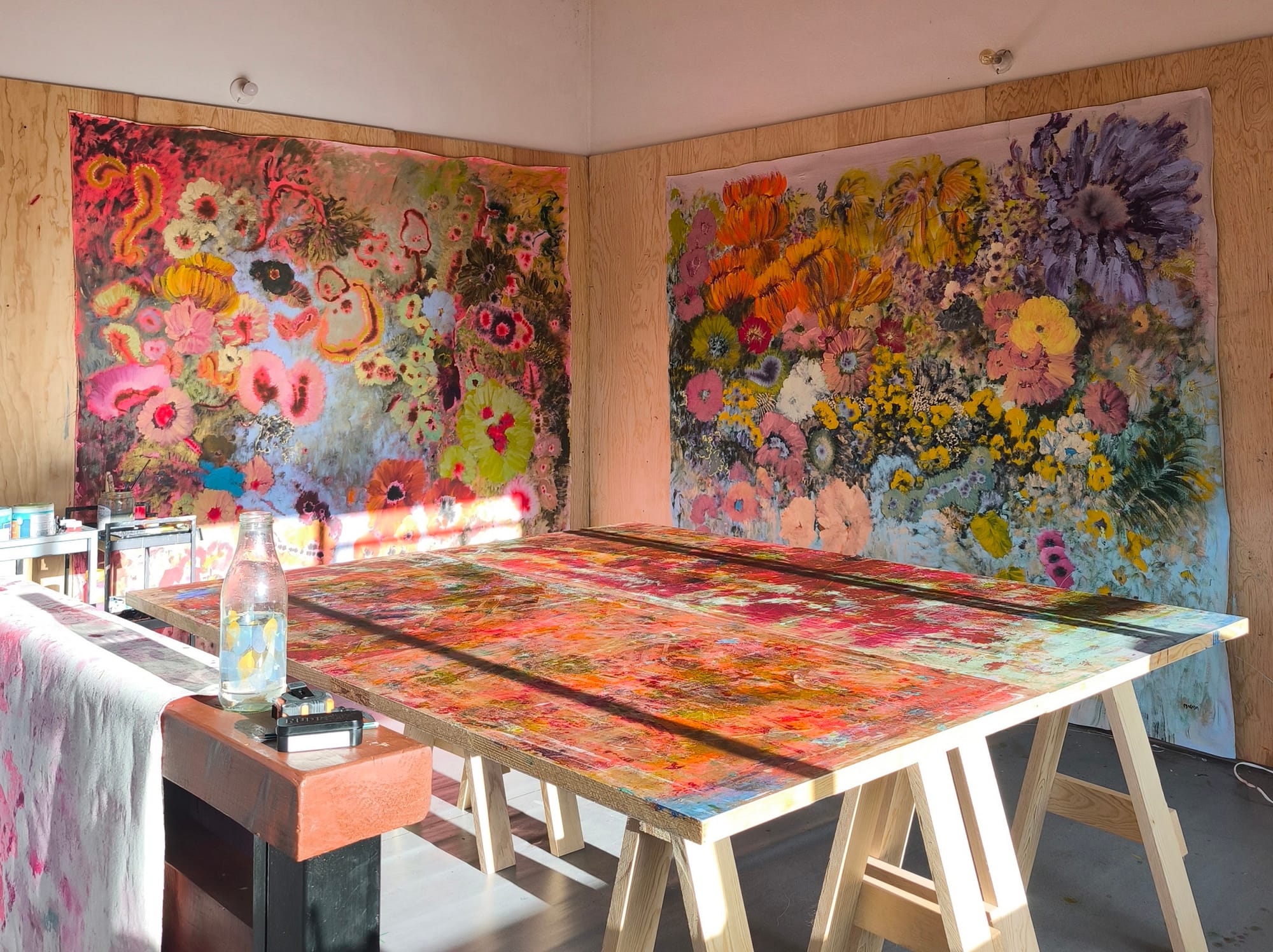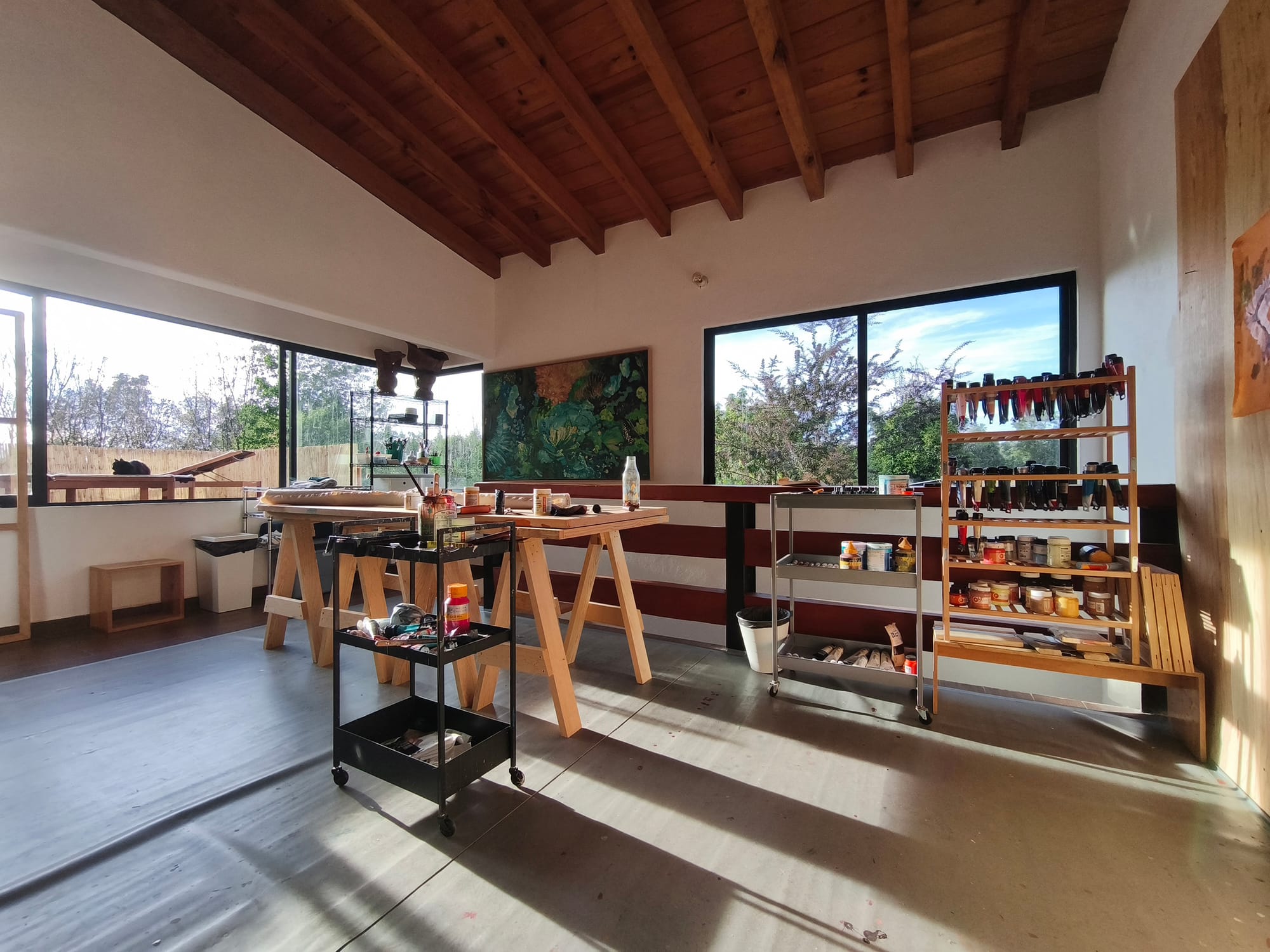 The studio is at my house within a ranch, surrounded by nature. It's on the second floor of the house, where there's better light. My routine all day shifts between studio work and housework, including outdoor garden work. I get up a bit before 7am, drink coffee in the yard, and get morning sunshine. Then my husband and I eat breakfast and do a bit of cleaning or some chores in the garden.