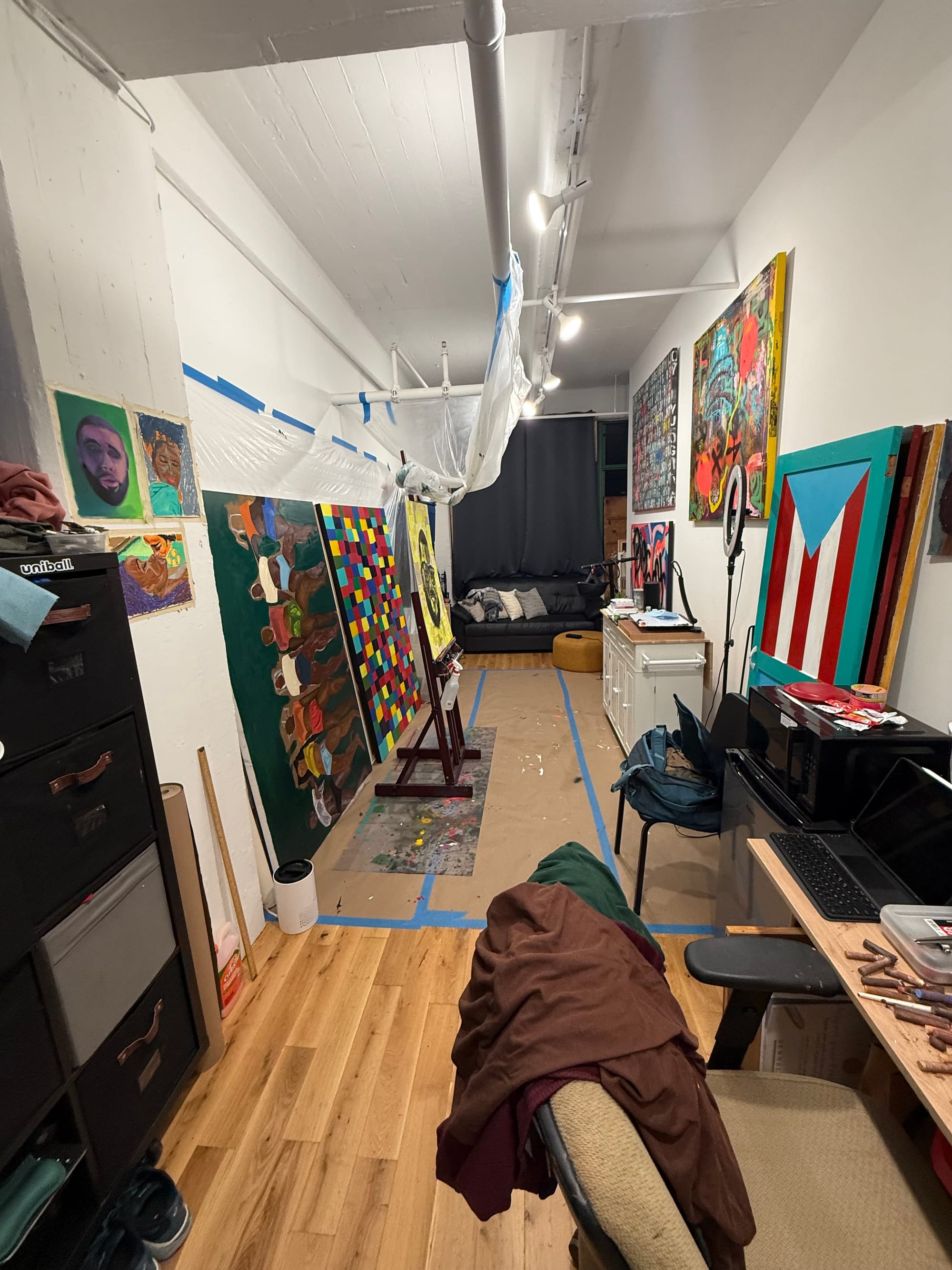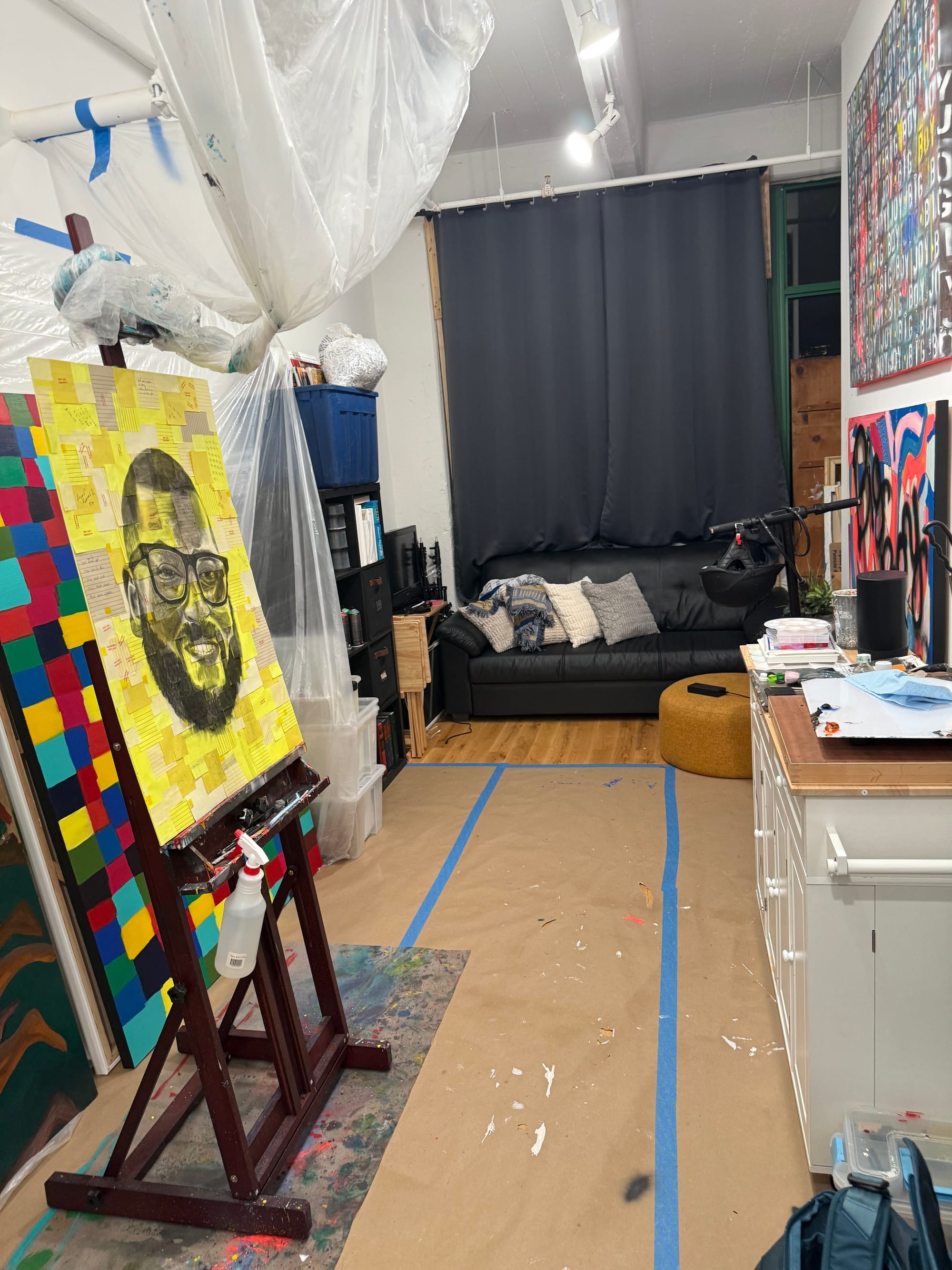 My studio is my evening and weekend getaway. I work as an attorney during the day and let loose at night in my studio, usually into the morning hours. As soon as I enter, the curtains open to a city night sky, my Spotify connects to my speaker, I change into my studio clothes, and I begin. My music selection ranges from salsa, reggae, soft rock, old school hip hop, classical, pop, Brazilian funk, and more! A beverage might be poured, or I'll take a quick smoke break before I begin. There are always several pieces being worked on at once. What I start with depends on my emotional and mental state. A long day at work may result in me pursuing a simple task such as canvas stretching, sealing, sketching, etc. Or a weekend might be a full 16-hour session, completely tackling one piece.