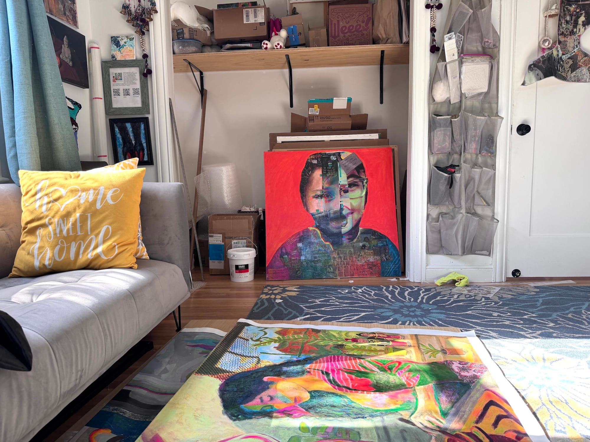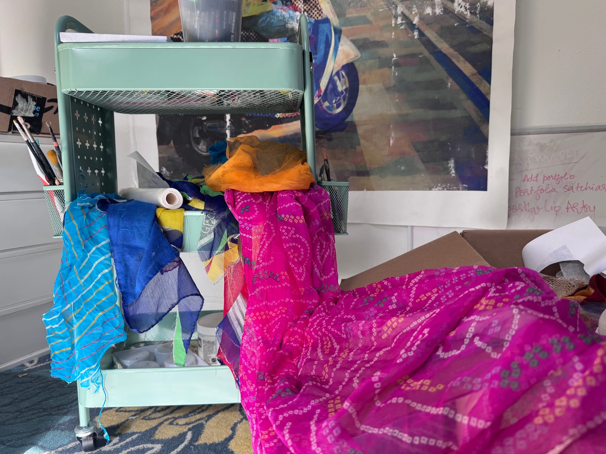 I sometimes wish I had studiomates. Working late nights from home can feel isolating, and I miss the shared energy, conversations, and friendships that come from being around other artists. Working from home also means being careful. At times I wish I could be messier and more impulsive with color without worrying about the space. And like most artists, I’m always wishing for more room. What once felt spacious is now filled with tools and stored work, especially as I start thinking about making sculptures and objects. A bigger studio feels like a future I’m slowly growing into.