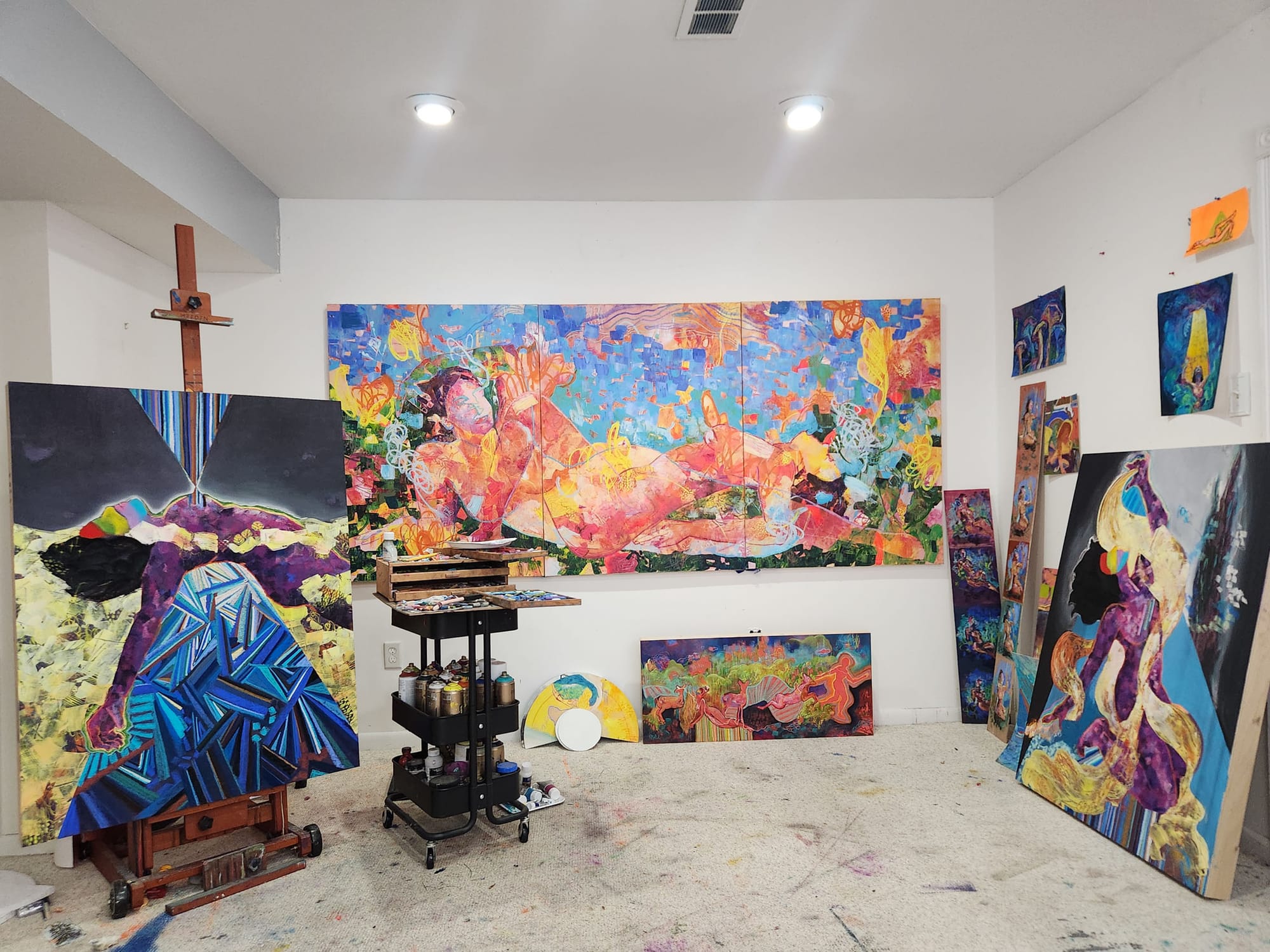 I chose my studio because it opens onto a garden, where I regularly observe squirrels, birds, and seasonal changes. Nature is a constant presence and returns directly in my work. The studio itself is highly flexible: Walls shift between photographic and open working surfaces, and furniture moves freely. This adaptability allows the work to change direction without resistance. The space has supported ambitious projects, including a 28-foot painting installed across three walls, titled "The Big Rip," which is about the moment when the universe begins to collapse.