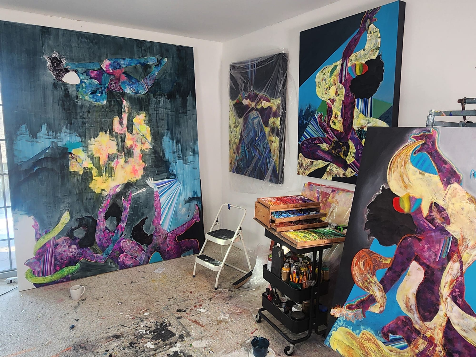 Anything in stick form, especially soft pastel. I’m drawn to their directness, the ability to transmit energy from my body straight onto a surface without intermediaries. Brushes and sponges translate movement through their own structure, but a stick remains faithful to the gesture. When I made the purple figures, pastel allowed me to build volume while maintaining layering and movement. It's a unique and misunderstood medium.