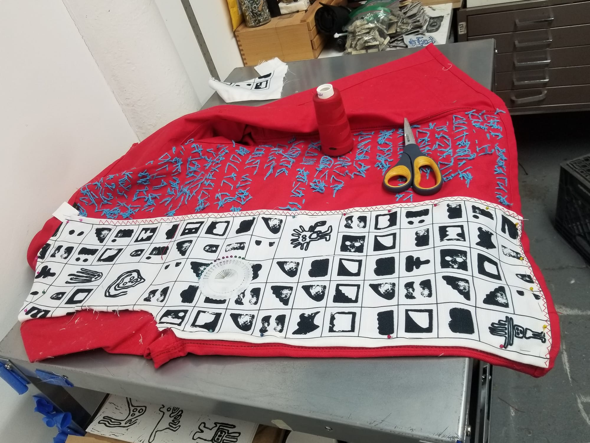 My studio is small. Over the years I have strategically used surfaces that move on wheels and I built shelves that I have placed to one side of the wall. I work between the floor and my various movable desks. My works are often small and personal, layering fabric, printmaking, collage, and found material. The process is intimate and slow and rhythmic. The few bigger pieces are made on the wall or laid out on the ground. Because my studio is a basement, it's also on a hill. I am always comically sliding downward or tilted at odd angles.