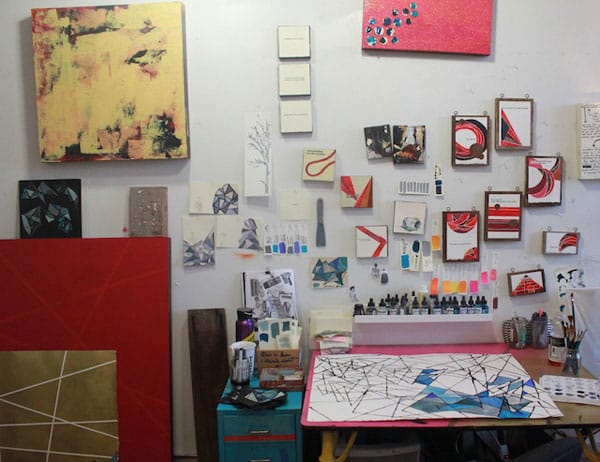 i love language; i paint it into landscapes of shape and color and absence. i sit here almost everyday. some days, i spend all my time talking to someone on the couch or at the door. i have made the re-arranging of my studio into it’s own art practice. i thrive on a balance between order and messiness. my most recent series started with the 6″x8″ marker drawings pinned next to the large red panel (the marker lines unsightly). from there, the color tests neatly labeled above the inks are my palette for the thick watercolor paper on the table. this practice eventually becomes part of the pile of small “geodes” to the left of the table.