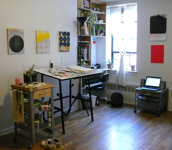 This is my living room studio. It’s a small space, so my setup requires that I be super tidy. I roll the cart and fold down the table behind a screen you don’t see on the left. I really love being able to work at home. It gives me lots of opportunities to space out and look at my work at any time I want — which is a lot. And it’s super convenient to go paint something when I get a “brilliant” idea in the shower or while vacuuming.